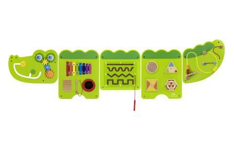 Zábavná dřevěná nástěnná hra ve tvaru krokodýla nabízí dětem pestré aktivity, které rozvíjejí jejich zručnost, logické myšlení a koordinaci pohybů. Obsahuje xylofon, magnetické bludiště, ozubená kolečka a další interaktivní prvky, které zaručí hodiny objevování a zábavy. Ideální doplněk do dětského pokoje, školky nebo herny.