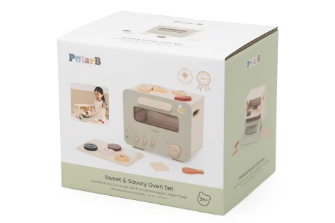 Balení obsahuje troubu o rozměrech 25x18,6x20,7 cm, oplatky, pizzu, párek a kuřecí paličku. Baleno v krabici.