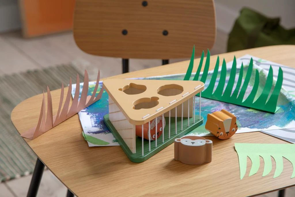 Dřevěná vkládačka s veselými zvířátky dítě zabaví na dlouhé hodiny. Trojúhelníková hračka má nahoře tři otvory ve tvaru zvířecích hlav. Pod vrchní deskou jsou natažené elastické gumičky, které tvoří východ, kterým musí zvířátka projít. Součástí jsou dvě dřevěné hlavičky zvířátek – tygra a lva. Hračka je vyrobena z přírodního odolného dřeva a je zdravotně nezávadná. Rozvíjí motoriku, koordinaci, myšlení a fantazii.