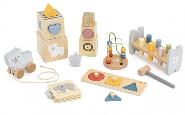 Vše pro rozvoj paměti a jemné motoriky. Sada obsahuje zatloukačku, skladací kostky, labyrint, vkládačku s tvary, tahačku a knížku.