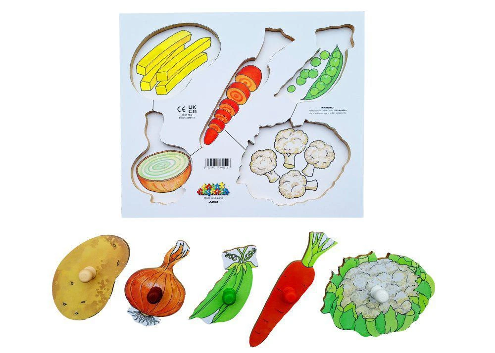 Just Jigsaws 151 Loupeme a krájíme plodiny 2 - dřevěné deskové puzzle 6 dílů představuje dřevěnou skládačku s kolíčky pro snadný úchop, která dětem krásně znázorňuje, jak vypadá zelenina i pod svojí slupkou.
