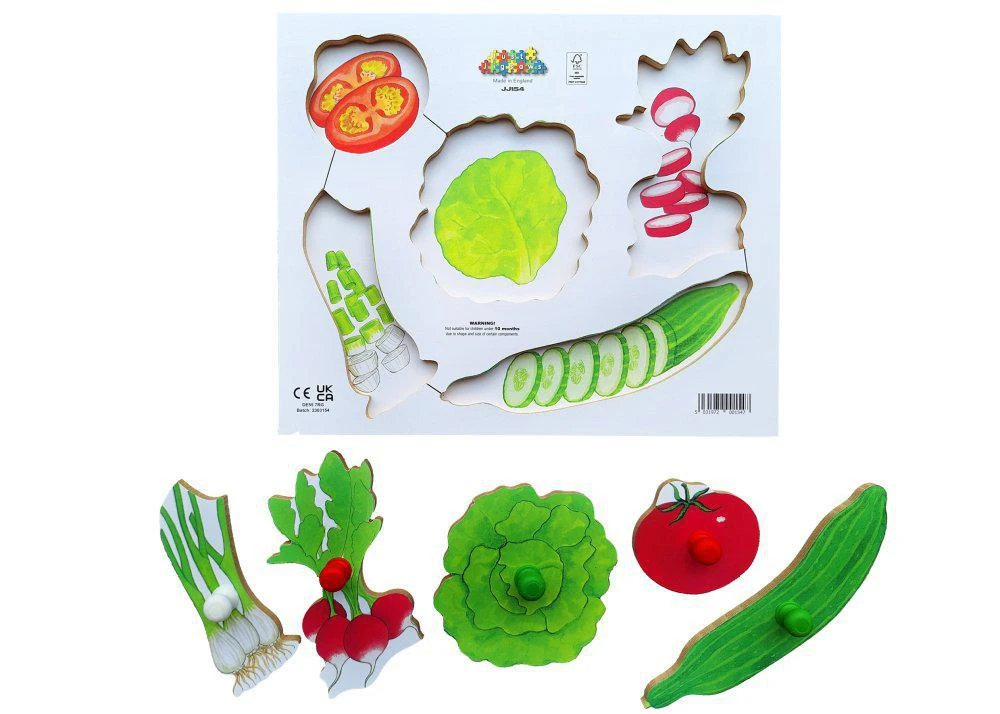 Just Jigsaws 154 Loupeme a krájíme plodiny 5 - dřevěné deskové puzzle 6 dílů představuje dřevěnou skládačku s kolíčky pro snadný úchop, která dětem krásně znázorňuje, jak vypadá zelenina i pod svojí slupkou.