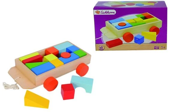 Sada barevných, dřevěných kostek různých tvarů pro nejmenší stavitele. Pro lepší převoz lze poskládat do vozíku a táhnout za sebou. Obsahuje 15 ks kostiček. Rozměry: 23x13,5x10cm.
