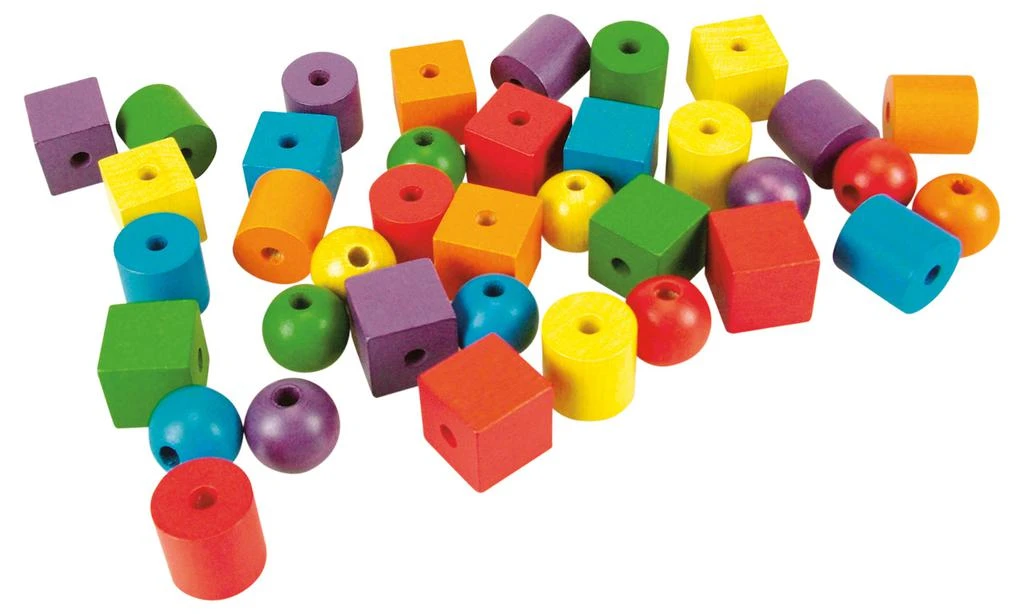 Set obsahuje dřevěné korále, které jsou velikostí uzpůsobeny zručnosti malých dětí. V balení jsou 2 navlékací šňůrky. Rozměr korálků: 3 cm.