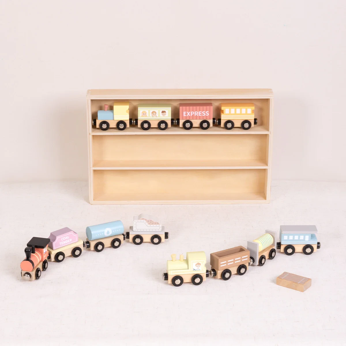 Sada obsahuje 3 dřevěné mašinky a 9 různorodých osobních i dopravních vagonů. Všechny se dají krásně spojit pomocí magnetek. Dřevěná vitrínka může při hře sloužit jako nádraží či parkoviště. Po hře do ní děti zase vše uklidí.