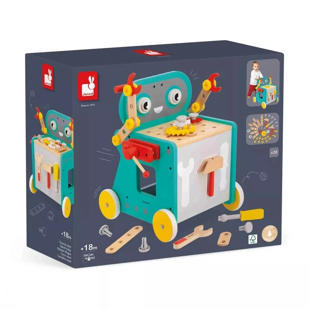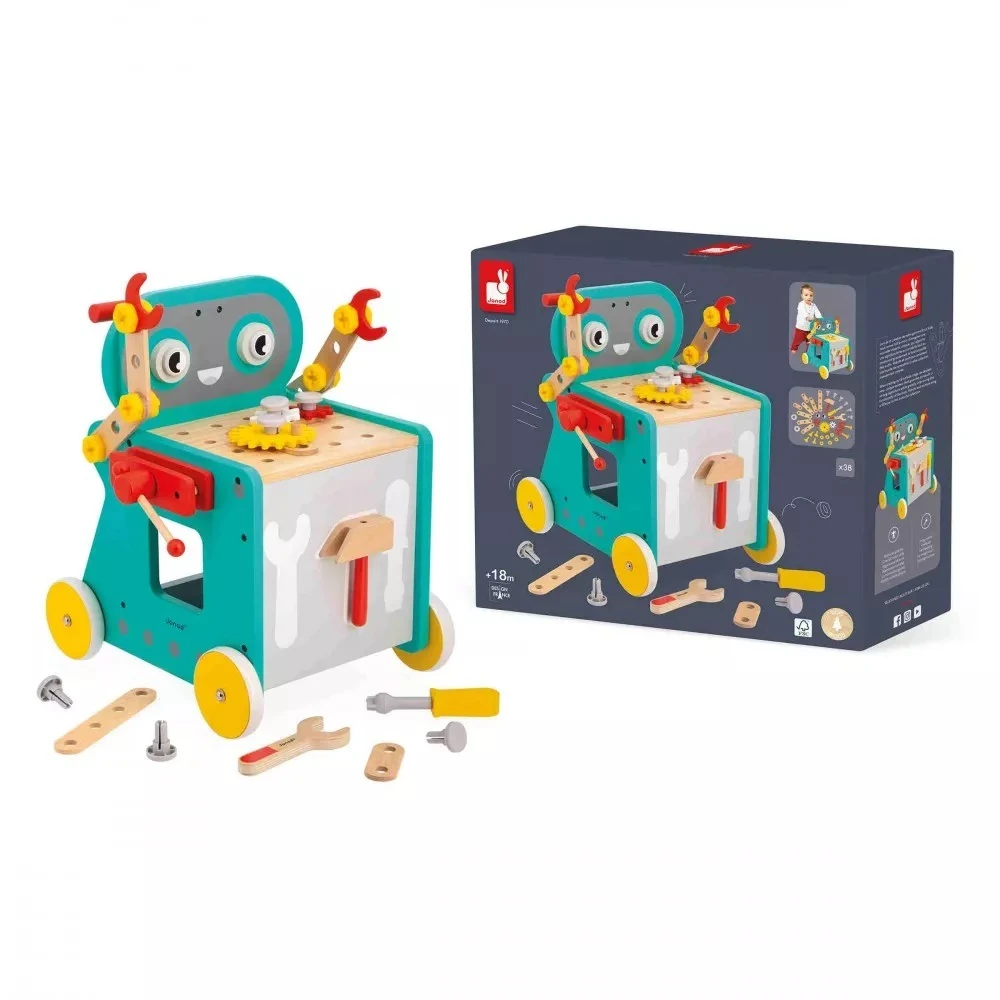 Obsahuje 18 dřevěných doplňků (desky a ozubená kola) a 20 plastových doplňků (šrouby, matice, hřebíky). Tento vozík 2 v 1 rozvine dovednosti chůze nejmenších a zručnost a představivost starších dětí. Bonus navíc – šrouby mají zářez, který přidává další výzvu a více příležitostí k hraní.
