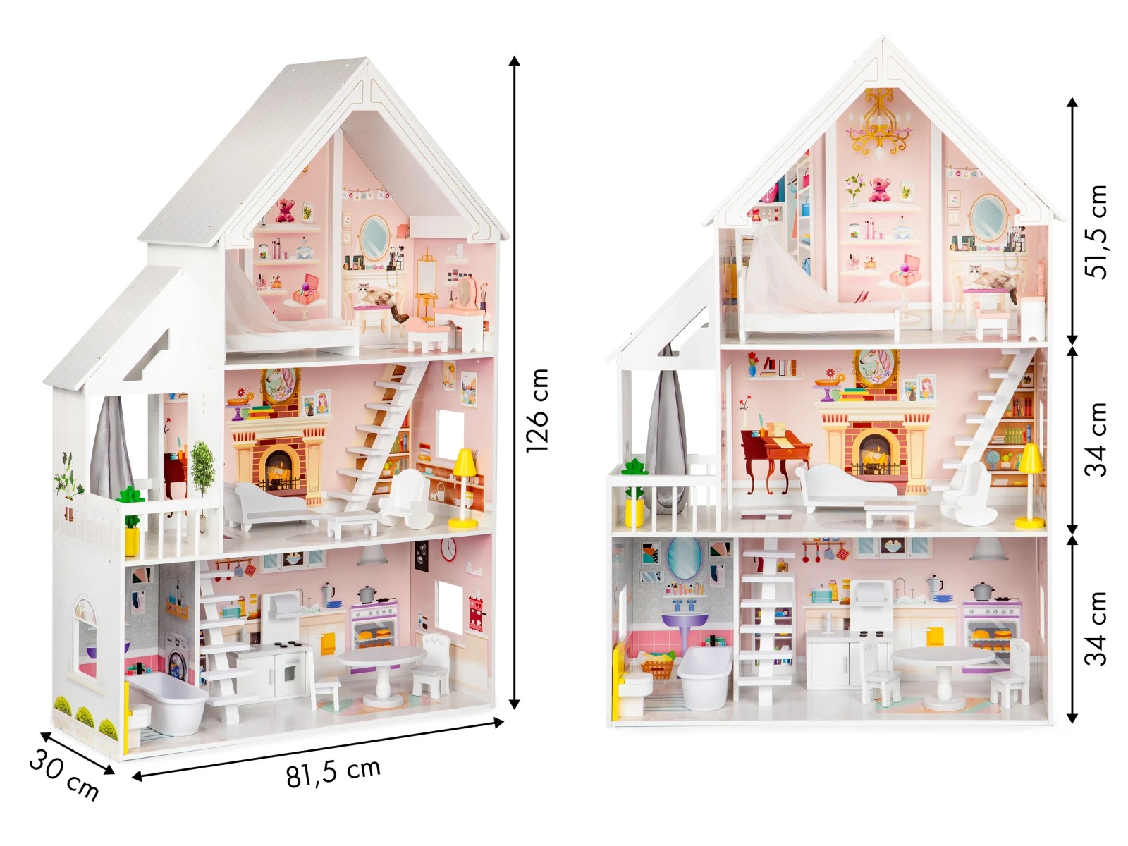 Celý domeček nabízí 3 samostatná podlaží a celkem 5 místností, které věrně připomínají skutečný rodinný dům. Každá místnost má vlastní styl a výbavu odpovídající jejímu účelu, ale děti si mohou kdykoli vyzkoušet roli designéra a uspořádat vše podle sebe. Součástí je také komplet 15 dřevěných kousků nábytku, které lze libovolně vyjímat a přestavovat bez omezení. 3 podlaží a balkon. V přízemí najdete koupelnu a kuchyni s nábytkem a sporákem. První dvě patra spojují bílé dřevěné schody. V prvním patře je prostorný obývací pokoj s pohovkou, stolkem a houpacím křeslem. Na stejné úrovni se nachází i malý balkon se zavěšenou houpačkou. Nejvyšší patro patří útulné ložnici s velkou postelí a toaletním stolkem. Takto navržené uspořádání dává neomezené možnosti hry a zaručuje hodiny tvořivé zábavy.