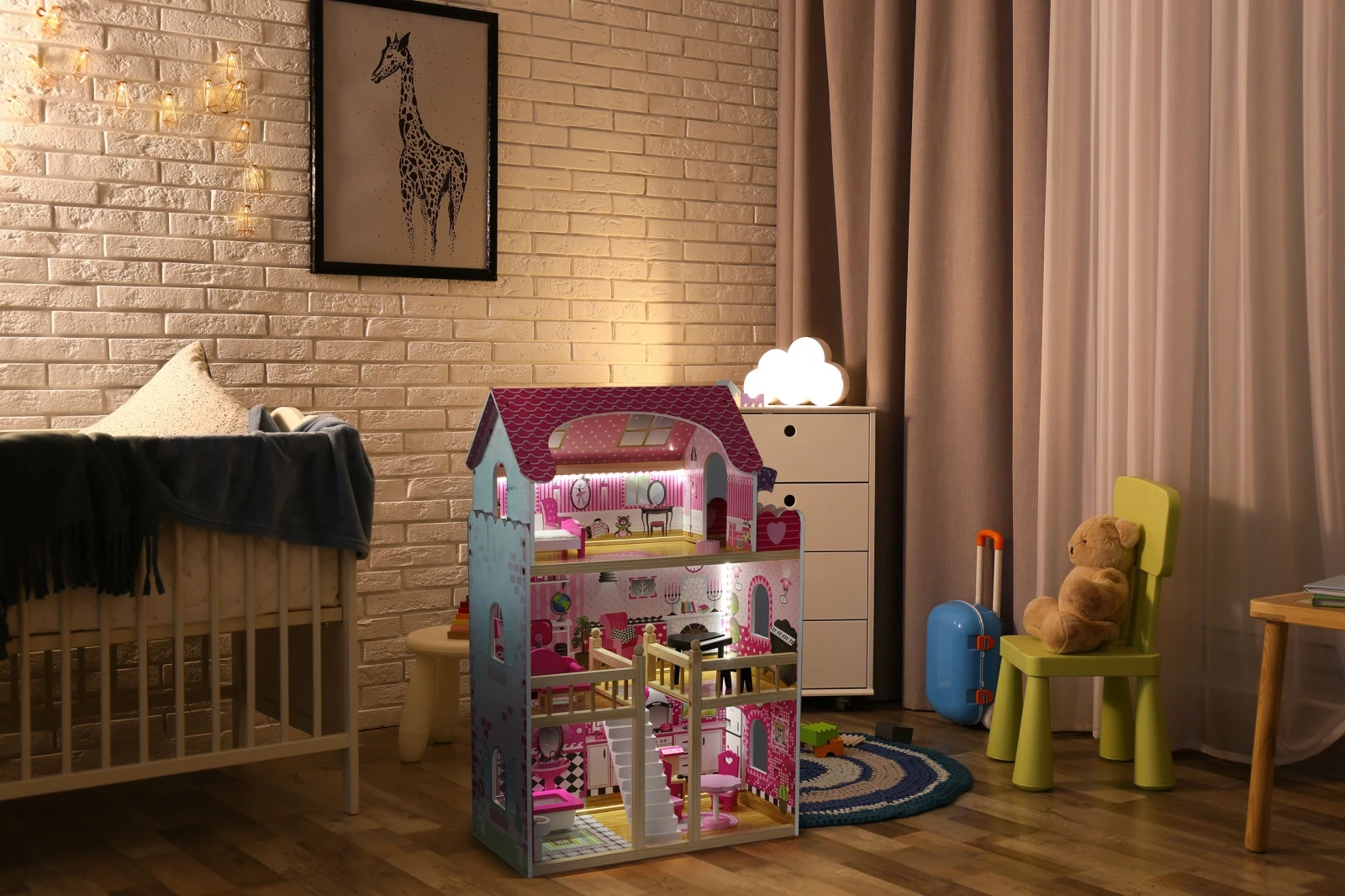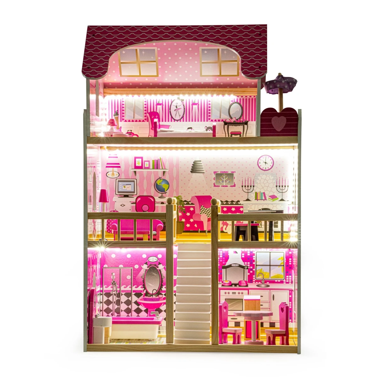 Dřevěný domeček pro panenky s nábytkem a LED osvětlením