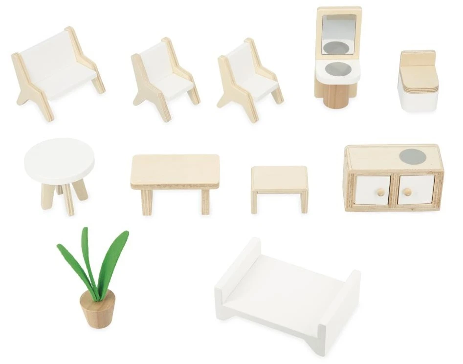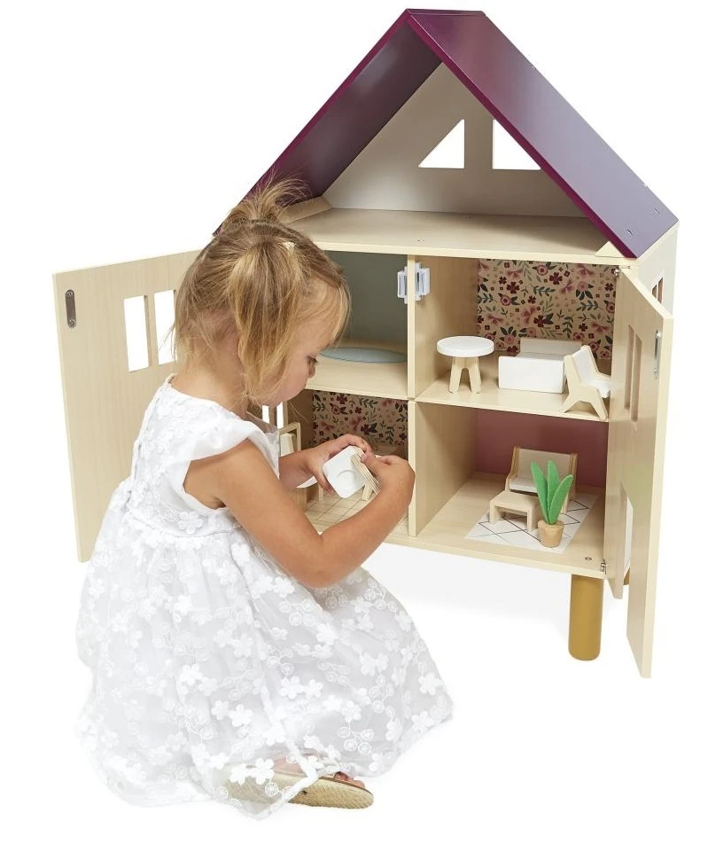 Domeček má magnetické dveře, které se doširoka otevírají na hraní a pak se zavírají, aby se všechno uvnitř uložilo pro snadnou přepravu. Hodiny her a sdílení, které vašemu dítěti umožní rozvíjet představivost a schopnost socializace. Hračka vyrobená z dřeva FSCTM.