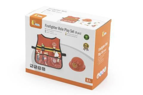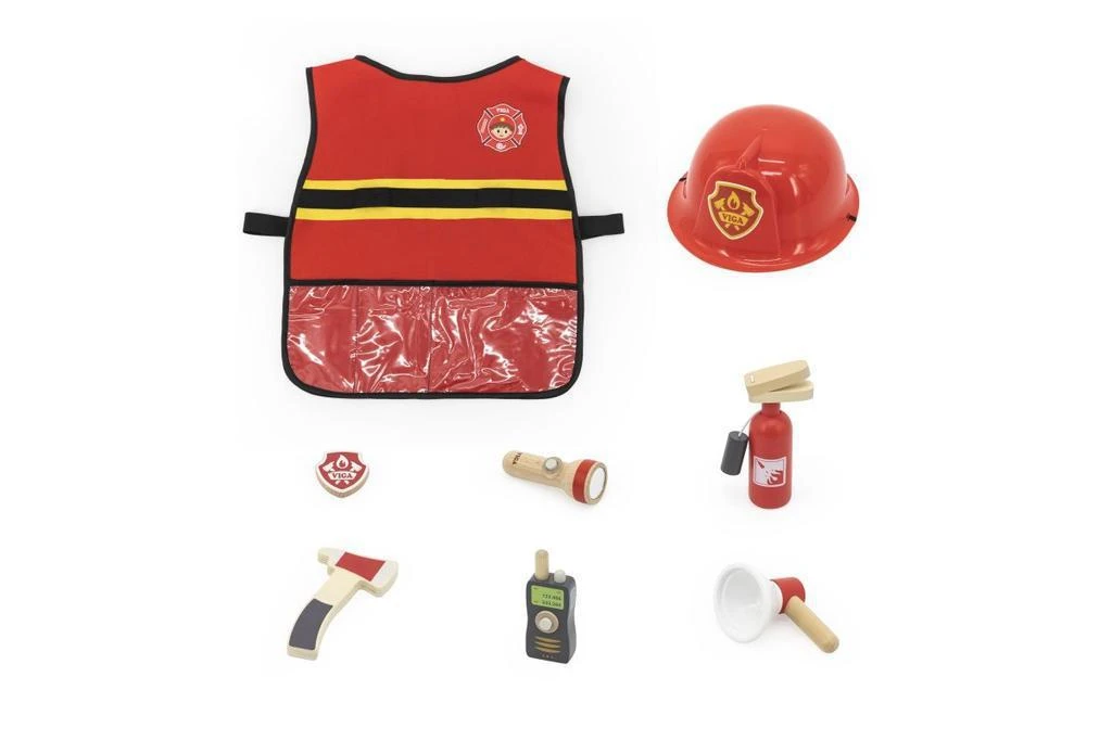 Hasičský set obsahuje látkovou vestu, plastovou helmu a 6 dřevěných hasičských pomůcek.