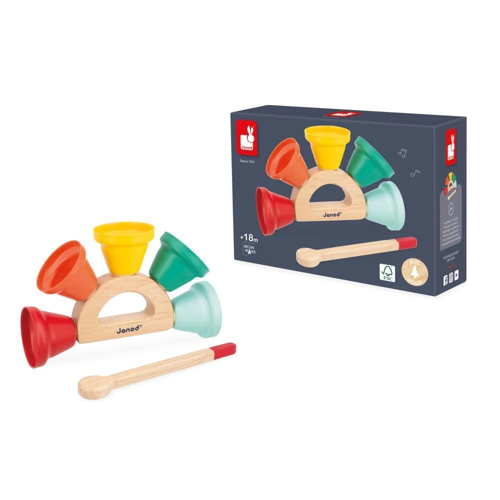 Tato snadno uchopitelná hračka pro děti nabízí zábavný úvod do zvuků. Barevné zvonečky stimulují zrakovou ostrost, jejich zvuk podporuje hudební povědomí a používáním proutku se zlepšuje koordinace pohybu. Každý zvoneček vydává jiný zvuk, díky čemuž mohou batolata objevovat nuance zvuku a rozvíjet sluch pro hudbu.