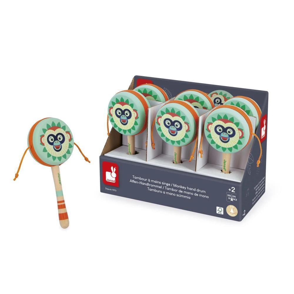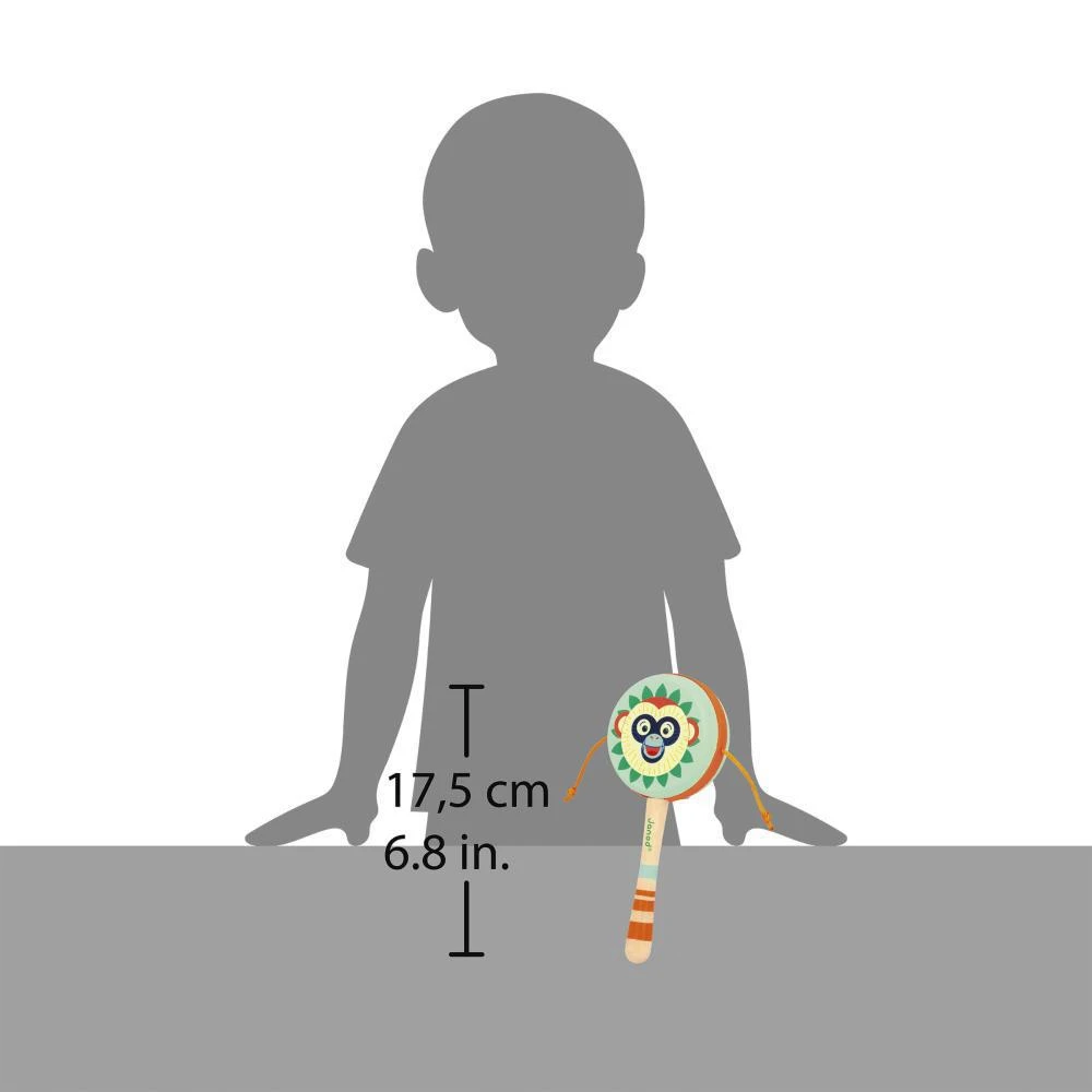 Díky dřevěnému ručnímu bubínku si děti mohou vymýšlet vlastní melodie a napodobovat dospělé se svým vlastním nástrojem. S délkou 17,5 cm se dobře drží a je velmi snadno ovladatelný i pro ty nejmenší.