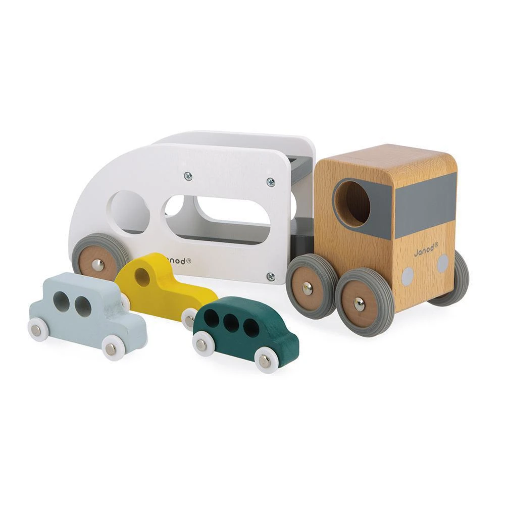 Dřevěný kamion s autíčky 3 ks Bolid Janod