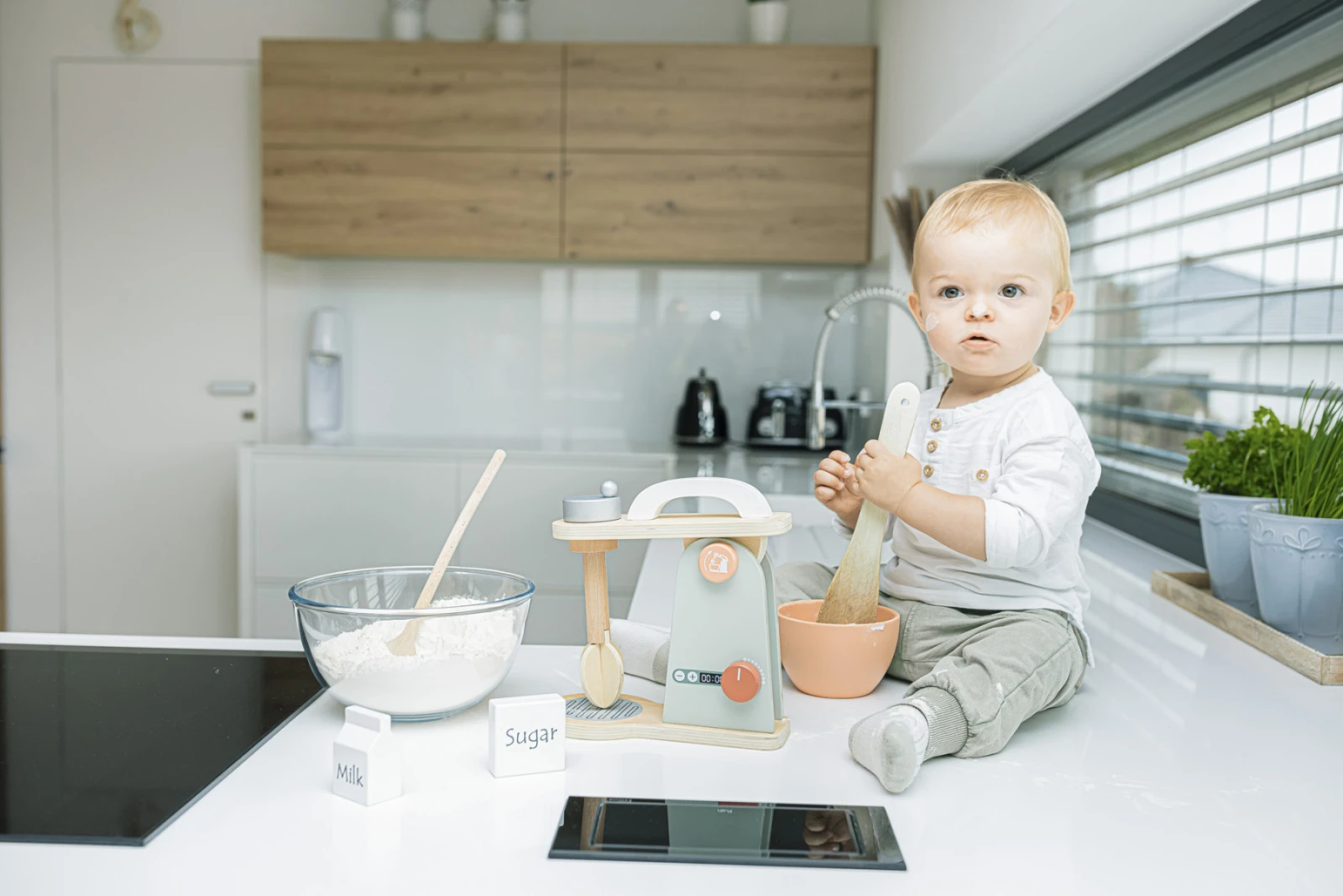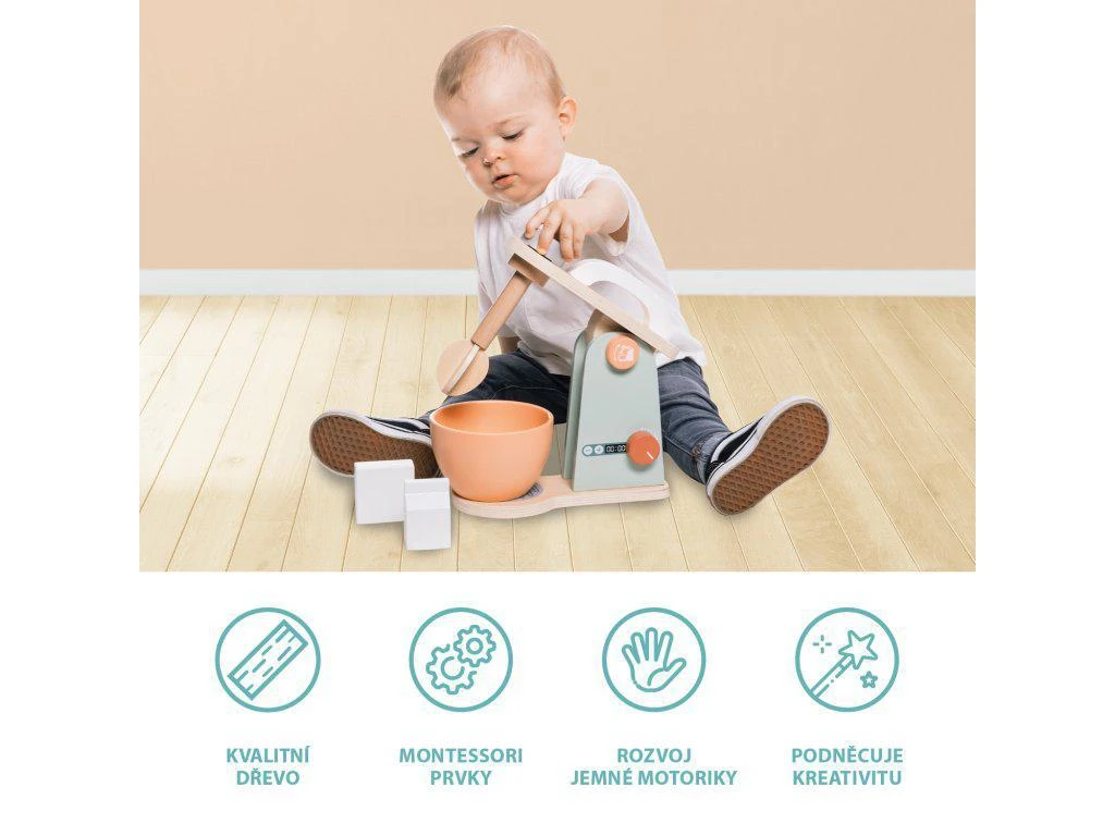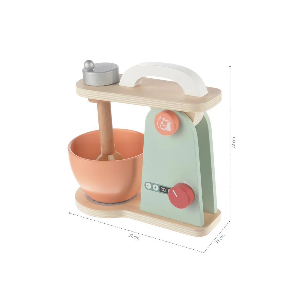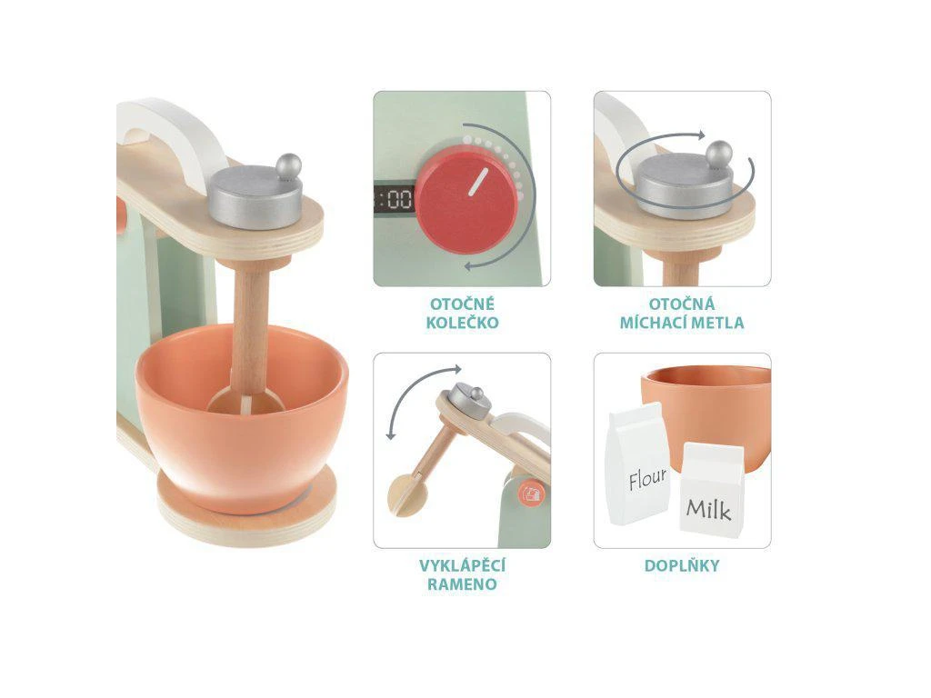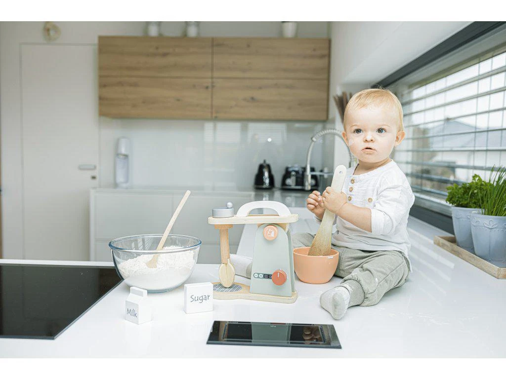 Propracovaný mixér pro všechny děti, které chtějí péct ty nejlepší moučníky. Mixér má několik tlačítek, které lze otáčet nebo stlačit. Součástí je mísa, ve které kuchyňský robot míchá těsto. Hračka je vyrobená z kvalitního dřeva a barev na vodní bázi.