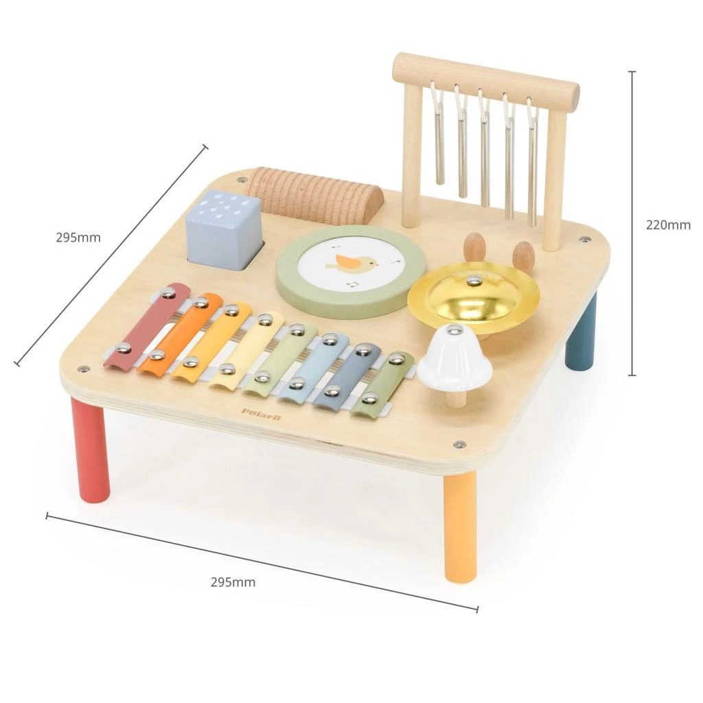 Stolek obsahuje xylofon, hudební kostku, bubínek, zvonek, gong, zvonkohru a skrabací váleček.