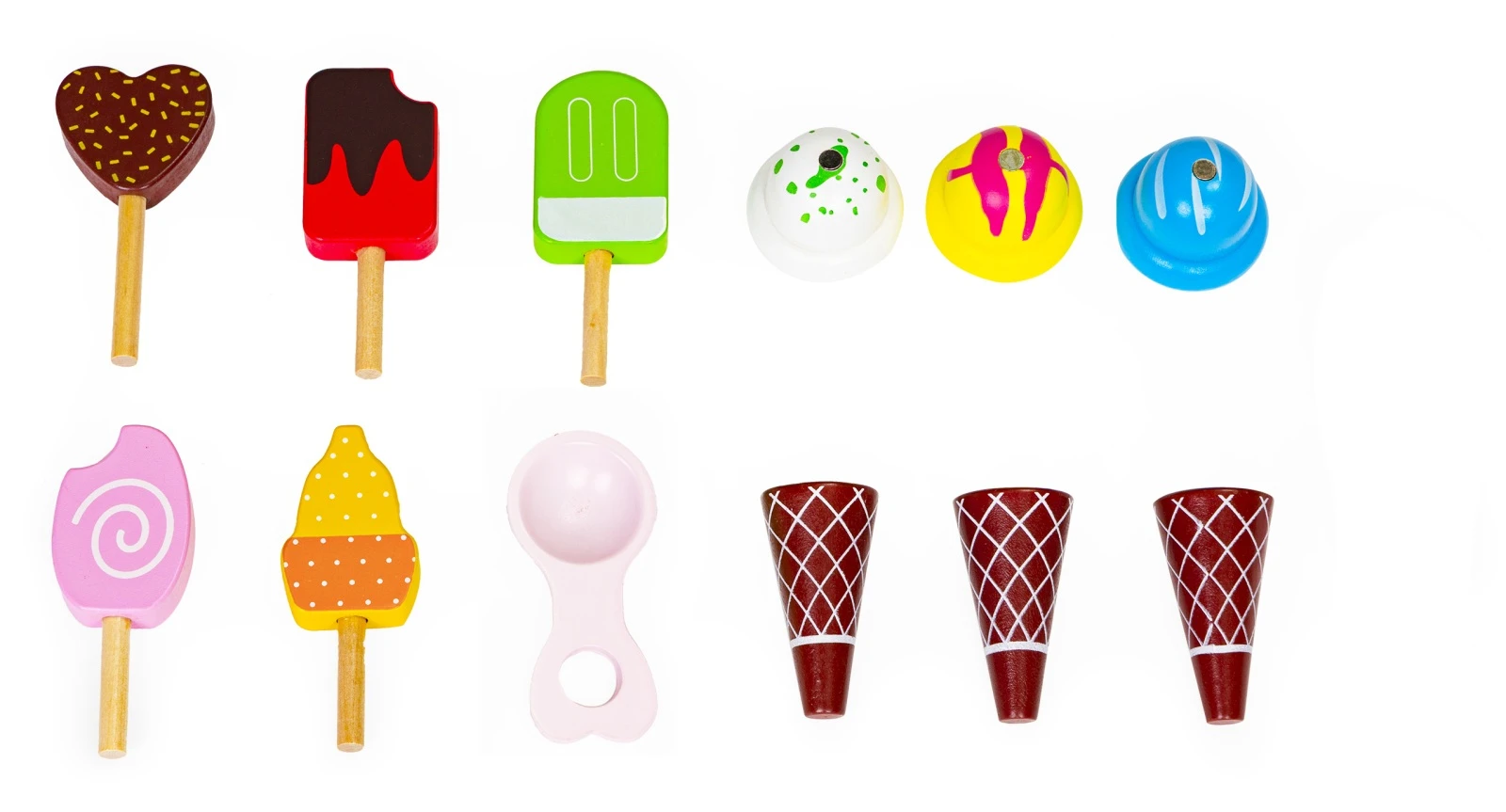 Sada obsahuje 5 nanuků, 3 kornouty a 3 různé kopečky zmrzliny a lžíci na nabírání. Protože kornouty a kopečky obsahují magnety, snadno se k sobě přichytí. Navíc je lze nabírat pomocí lžíce, která také obsahuje magnet, takže hra je ještě zábavnější a realističtější.