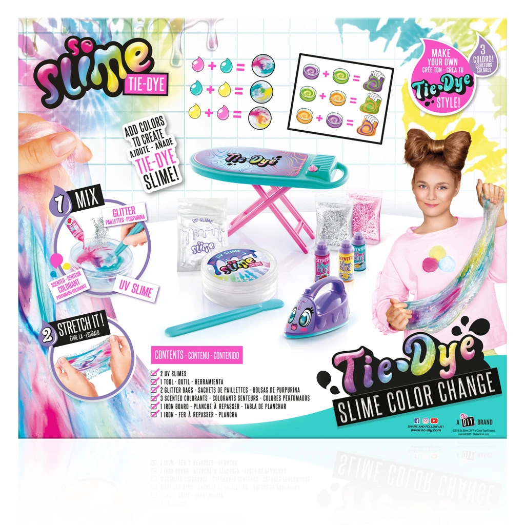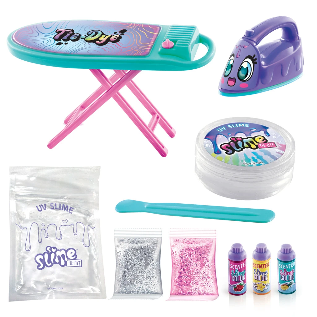 Součástí balení je plastové žehlící prkno s růžovými nohami a tyrkysovým povrchem ozdobeným nápisem „Tie-Dye“, dále roztomilá fialová žehlička s tvářičkou, která slouží k aktivaci UV světla. Kromě toho jsou v balení dva sáčky průhledného slizu, tři lahvičky s vonnými barvami (vanilka, ananas, jahoda), dvě sáčky třpytek (stříbrné a růžové), a také míchátko na práci se slizem. Baterie typu LR44 pro žehličku jsou součástí balení, což umožňuje okamžité použití bez nutnosti dokupování.