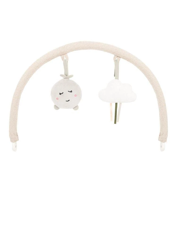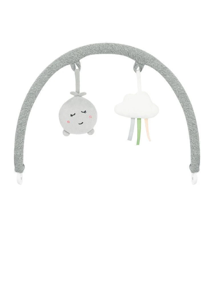 Součástí houpátka je také hrazdička se dvěma měkkými hračkami – pro snadné upevnění je přichycena pomocí magnetu.