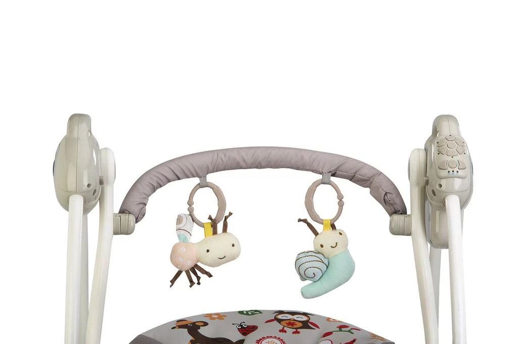 Lehátko nabízí výběr z 6-ti rychlostních stupňů, které odpovídají úhlům rotace od 10° do 30°. Lehátko lze polohovat do dvou pozic. Lehátko je vybaveno hrazdičkou s krásnými hračkami z měkkého materiálu (šnečkem a včeličkou). Pro snadnější manipulaci a na cesty lze lehátko složit do úsporné velikosti.