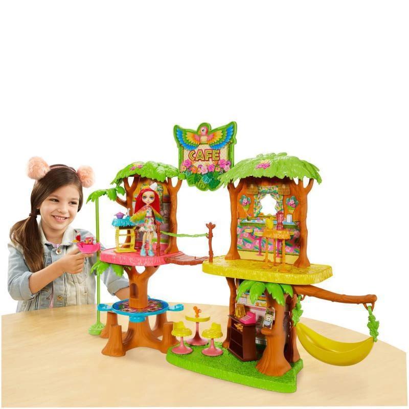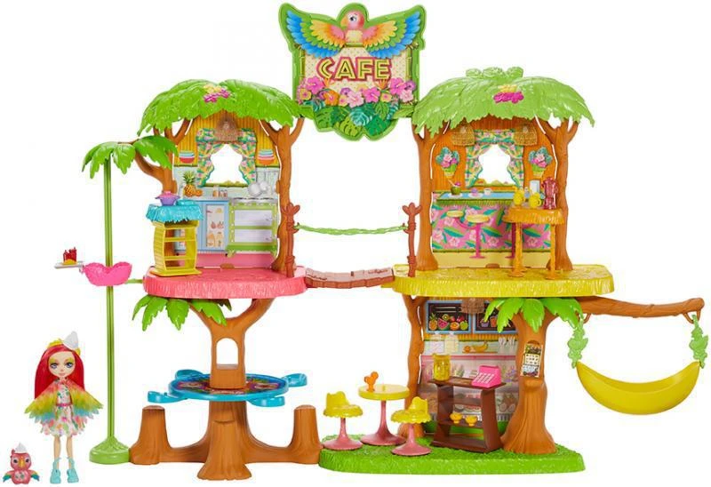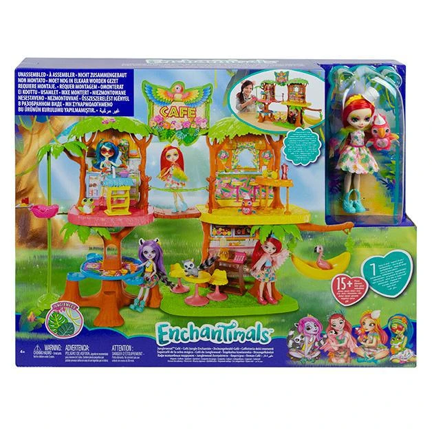Vstup do této úžasné kavárny ukryté hluboko v džungli a vychutnej si s panenkami Enchantimals osvěžující tropické nápoje. S radostí tě obslouží panenka Peeki Parrot a její papoušek. V prvním patře najdeš objednávkový pult s pokladnou a kompletním menu, kulatý stůl se židlemi a houpací síť. V druhém patře pod palmovými listy na tebe čeká kuchyňka s umyvadlem a bar na vychutnání si osvěžujícího tropického nápoje. Přesouvat jídlo mezi patry můžeš díky plně funkčnímu výtahu, který obsahuje košík a podnos na potraviny. Balení obsahuje: kavárnu, panenku, zvířátko a více než 15 doplňků. Rozměry balení: 43 x 38 x 10 cm.