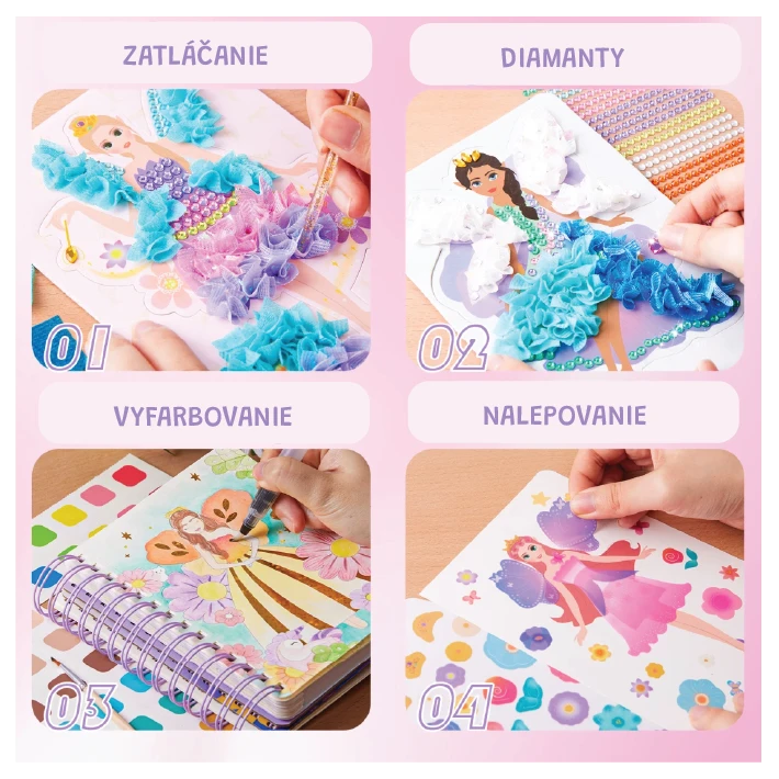 - 6 x šablon vil + textilní čtverečky + barevné kamínky – děti mohou pomocí vtlačování textilních čtverečků a lepení kamínků zkrášlit a dotvořit vílám šaty