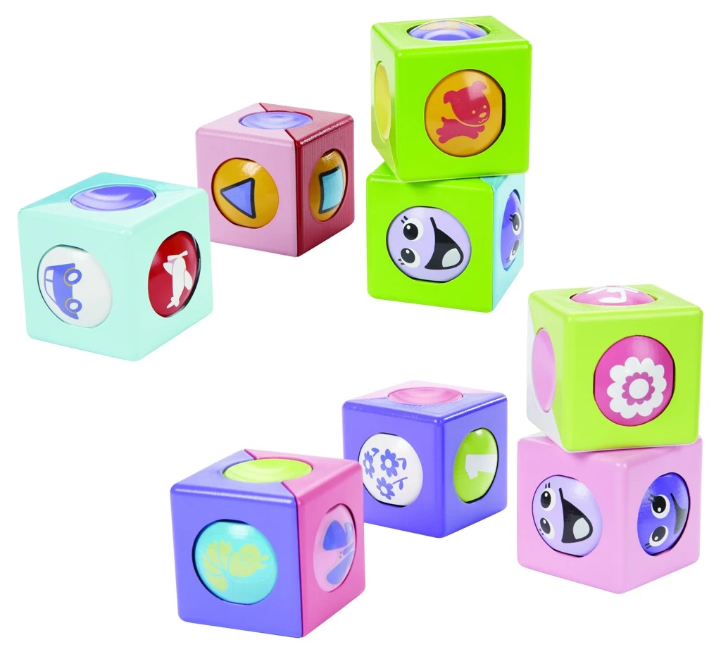 Balení obsahuje 4 různé točící kostky, jejichž barvy stimulují smysly dětí.