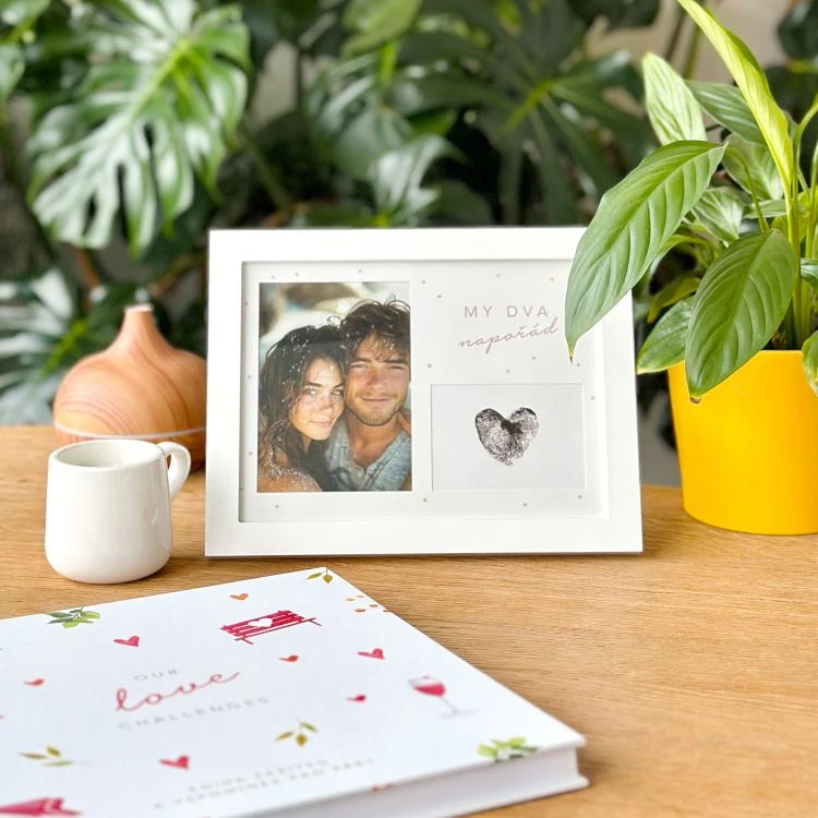 Balení obsahuje: bílý fotorámeček, černou inkoustovou podložku na otisky, potiskové papíry a návod.