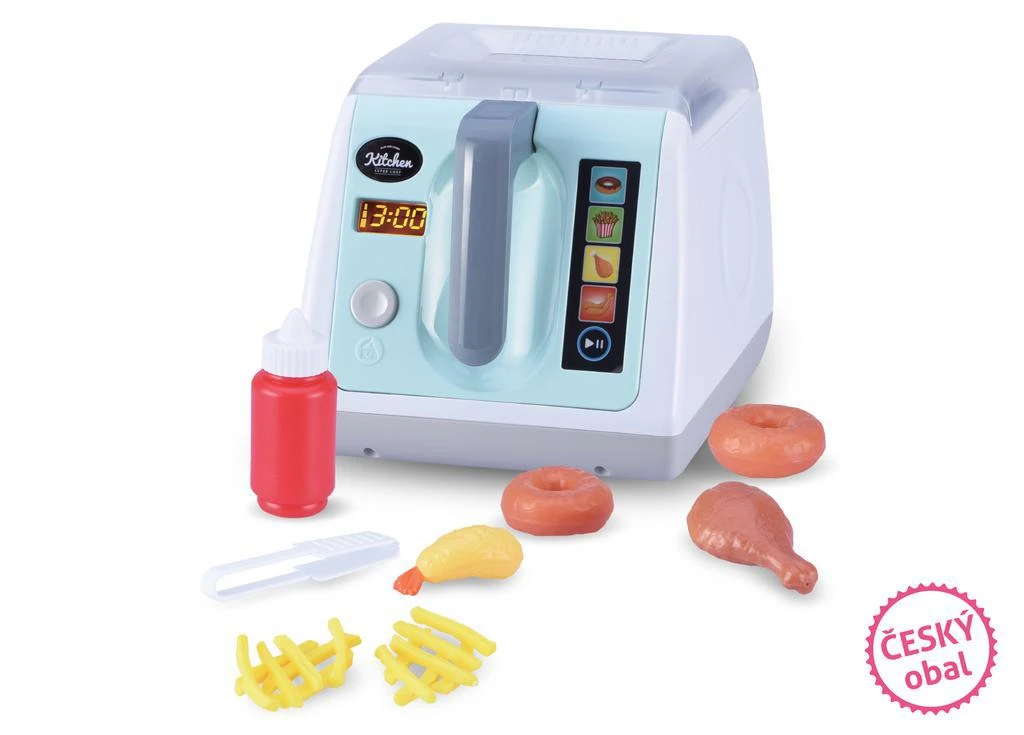 Fritéza při smažení svítí a vydává zvuky jako opravdová a nechybí ani časovač! Tak dobrou chuť!Součástí balení: 2x hranolky,1x kuřecí stehno,1x kreveta, 2x donut, naběračka, kečup