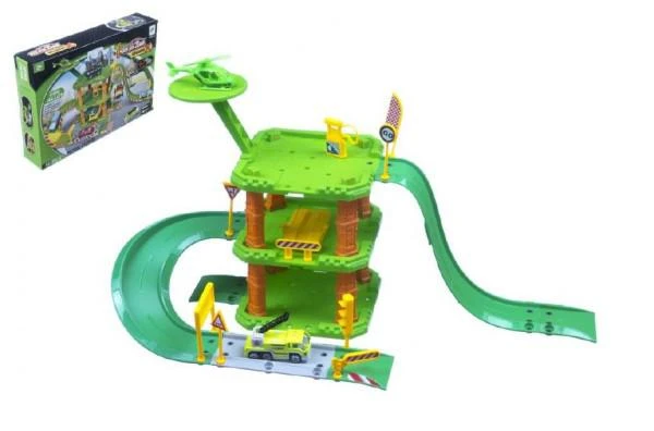 Plastová garáž na autíčka na tři patra. Součástí balení je jedno autíčko a vrtulník. Dále návod, který je uvedený na krabici a spoustu dalších plastových značek, semaforů a dalšího příslušenstv, které patří k sestavení garáže. Balení obsahuje 50 dílků.