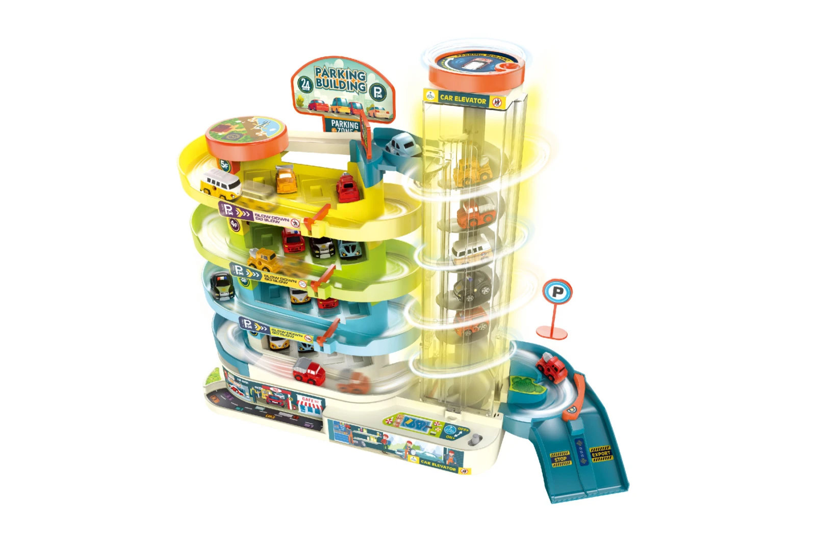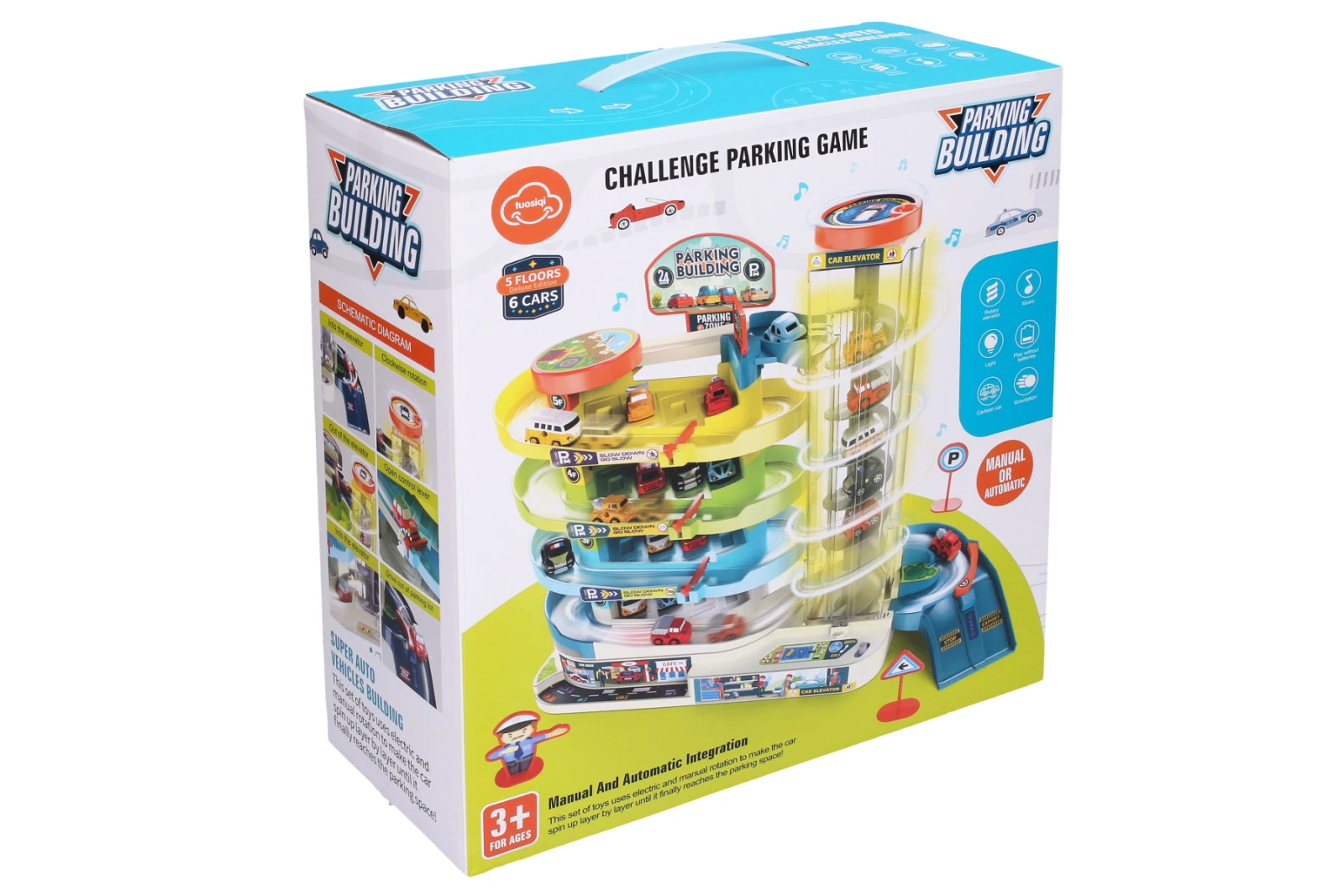 Světelné a zvukové efekty. Provoz výtahu na baterie či manuálně (přepínač). Obrázkový návod na složení na zadní straně obalu.