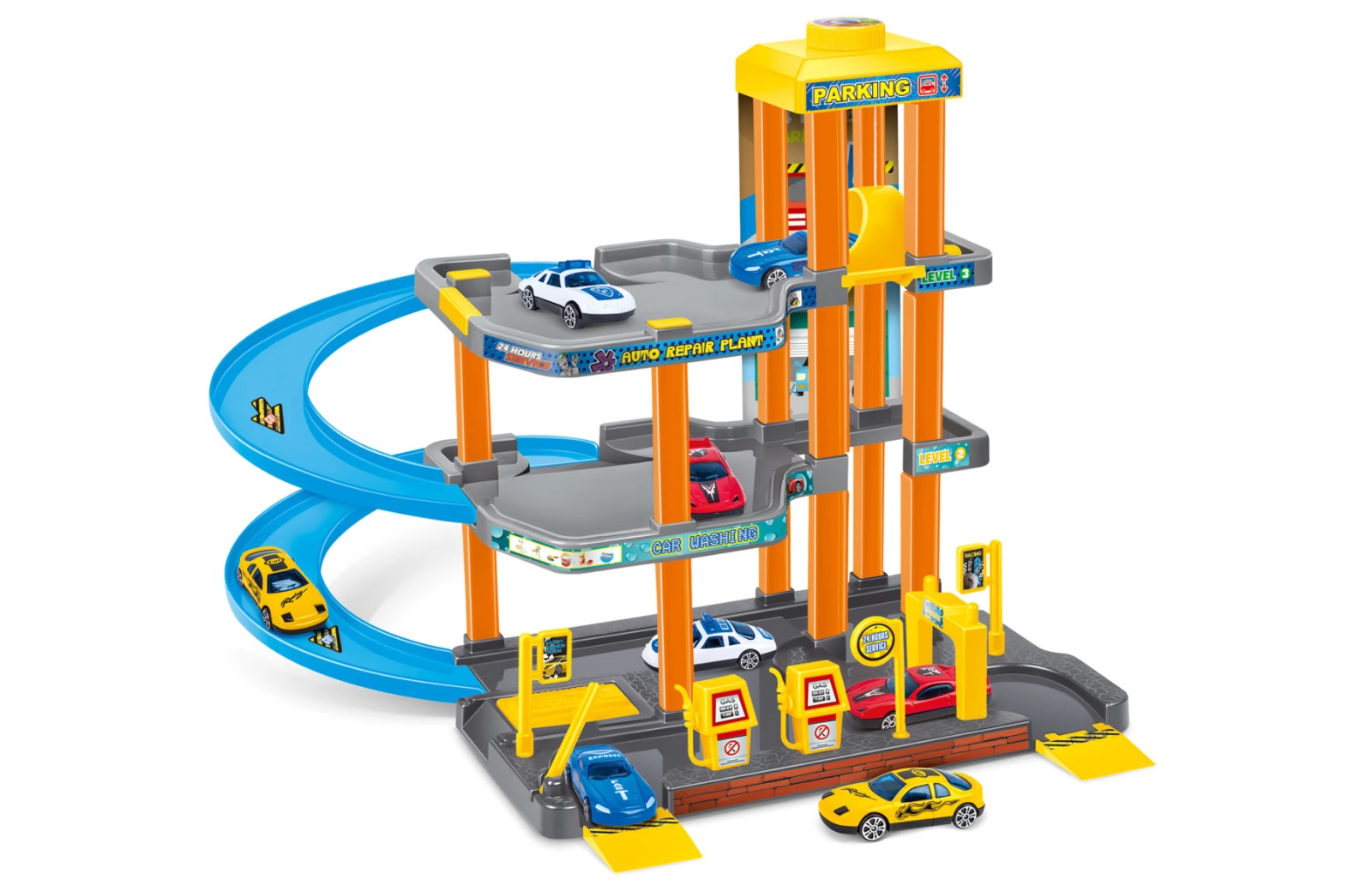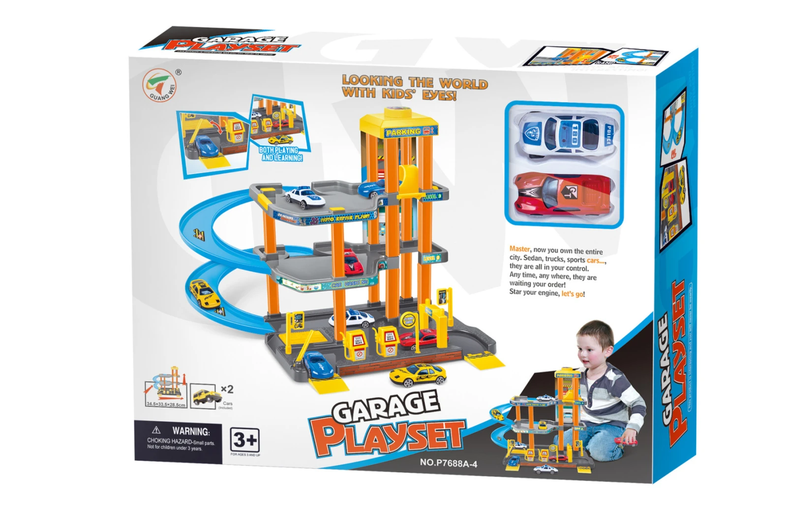 Balení obsahuje skládací garáž a 2 plastová auta.