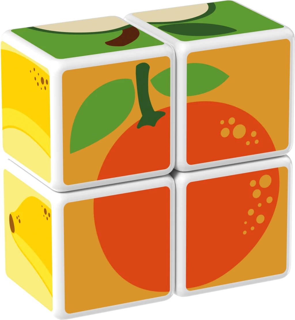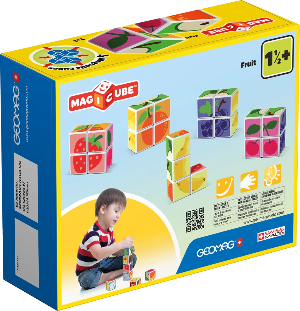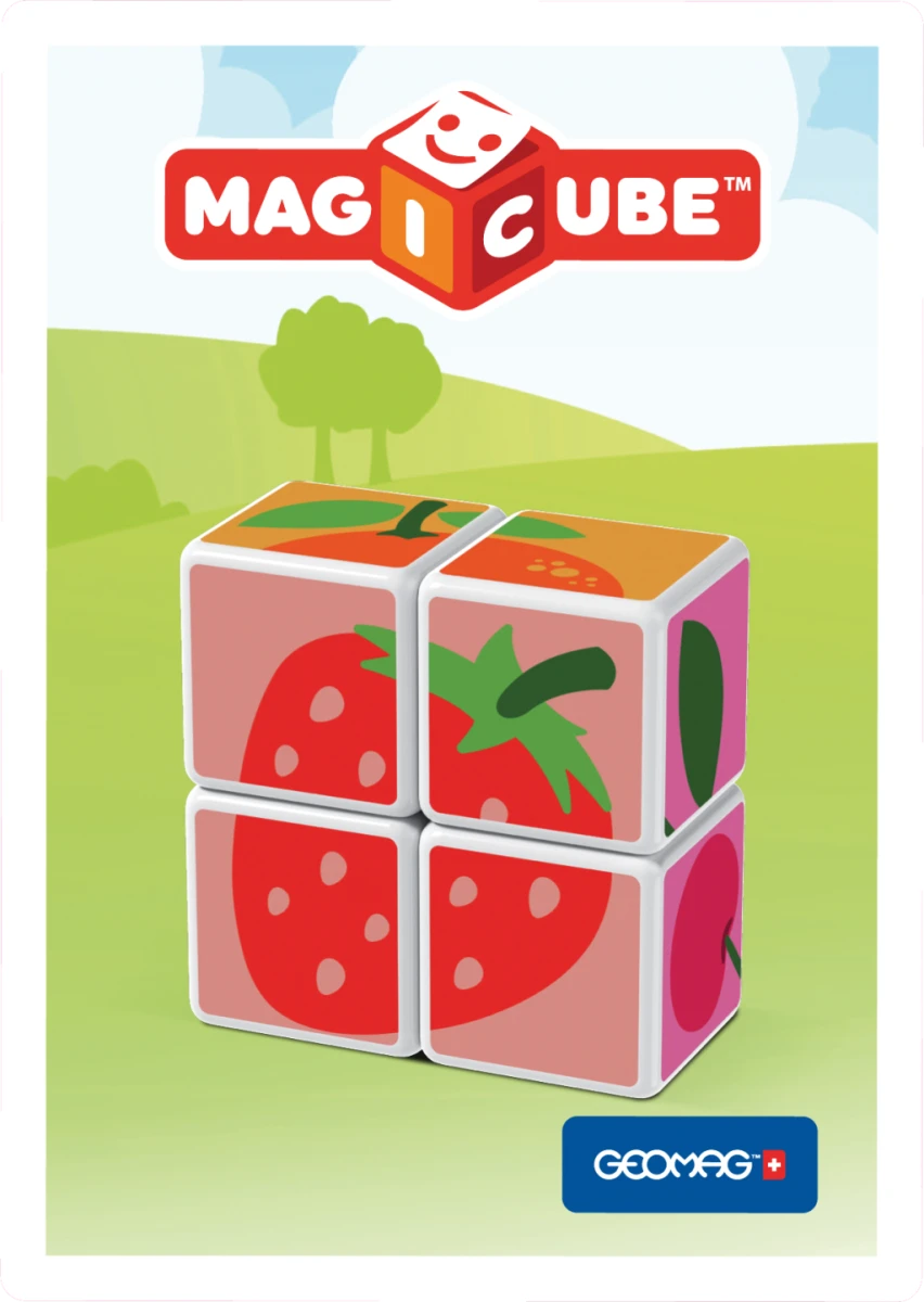 Sada obsahuje čtyři magnetické kostky, které lze snadno spojovat díky integrovaným magnetům a vytvářet tak různé tvary i kombinace. Každá kostka je potištěná barevnými obrázky ovoce, mezi nimiž naleznete jablíčko, banán, jahodu, třešně, hroznové víno a pomeranč, což dětem pomáhá s rozpoznáváním a pojmenováváním různých druhů ovoce
