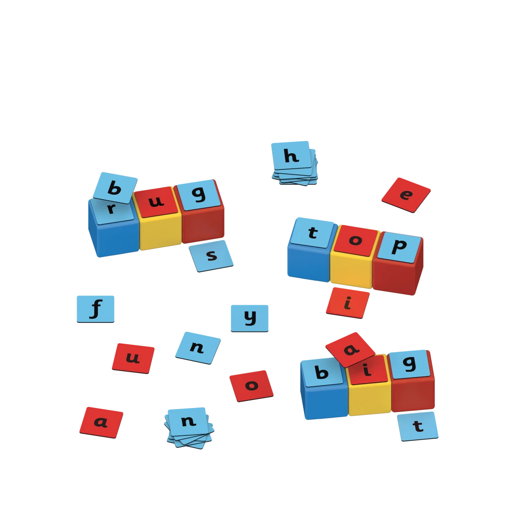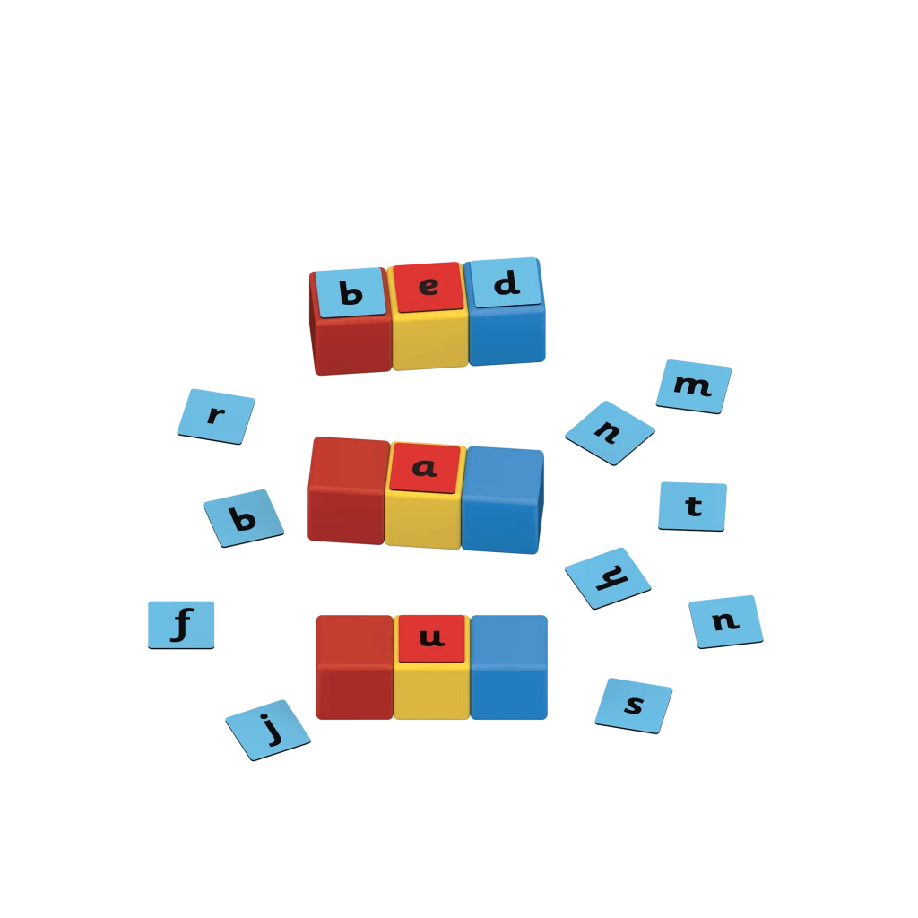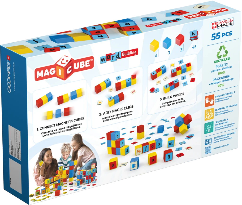 Sada obsahuje 10 magnetických kostiček ze 100% recyklovaného plastu a 45 klipů. Barevně jsou odlišeny samohlásky a souhlásky, klipy jsou oboustranné. Stavebnice pomáhá při rozvoji kreativity, jemné motoriky a pomocí hry s písmeny a obrázky stimuluje zvědavost, hledání řešení a zkoumání systému magnetismu.