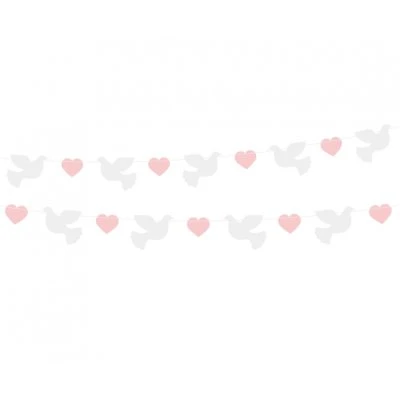 Papírová girlanda s motivem hrdliček a růžového srdce je krásnou dekorací pro romantické i slavnostní příležitosti. Jemné provedení v růžových tónech se skvěle hodí na svatby, zásnuby, baby shower, oslavy narození miminka nebo jiné slavnostní události.