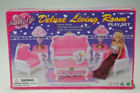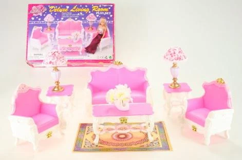 Glorie Obývák Deluxe obsahuje plastový gauč, 2 křesla, konferenční stolek s plastovou ozdobou ve formě labutě s květinami, dva stolky, na kterých jsou postaveny lampičky. Panenka není součástí balení. Věk 3+