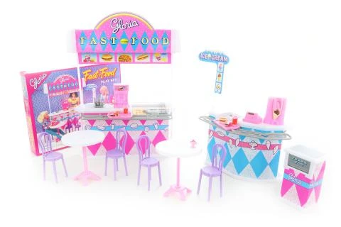 Glorie rychlé občerstvení obsahuje pult s občerstvením o rozměrech cca 31 x 42 x 7 cm, pult se zmrzlinou 24 x 32 x 6 cm, dva stoly 10,5 x 12 cm, 4 židle 4,5 x 12,5 x 5 cm a odpadkový koš 7 x 13 x 6 cm. Součástí jsou také doplňky (automat na nápoje, pokladna, přístroj na zmrzlinu, tácy, jídlo a další.