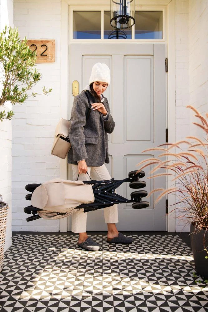 Díky snadnému a rychlému skládání kočárku MoMi AKIRA jej snadno uložíte do auta. Kromě toho je kočárek vybaven držadlem pro přenášení složeného kočárku.