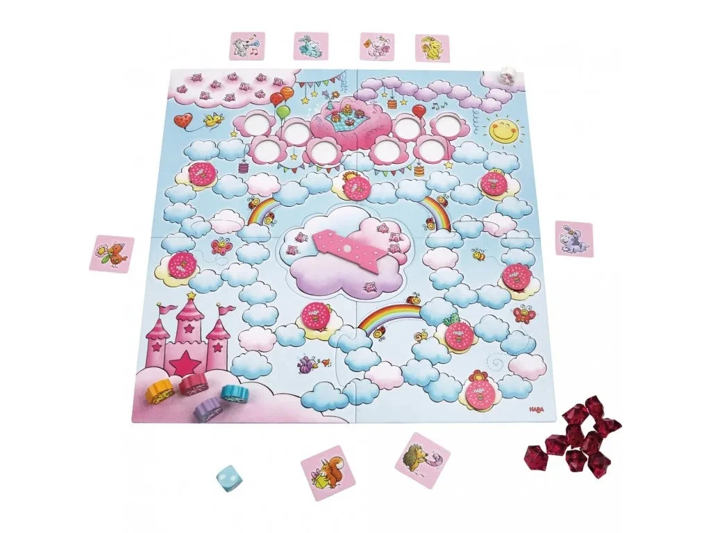 Obsah hry 4 jednorožci: Třpytivé štěstí (tmavě růžový), Hvězdný prach (žlutý), Kouzelný květ (fialový), Magický vír (tyrkysový), 1 malý jednorožec Rosalie (růžový), 1 kostka, 1 herní deska s rotující šipkou, 8 kulatých dílků přátel, 8 čtvercových dílků přátel, 10 obláčkových krystalů, 1 pravidla hry.