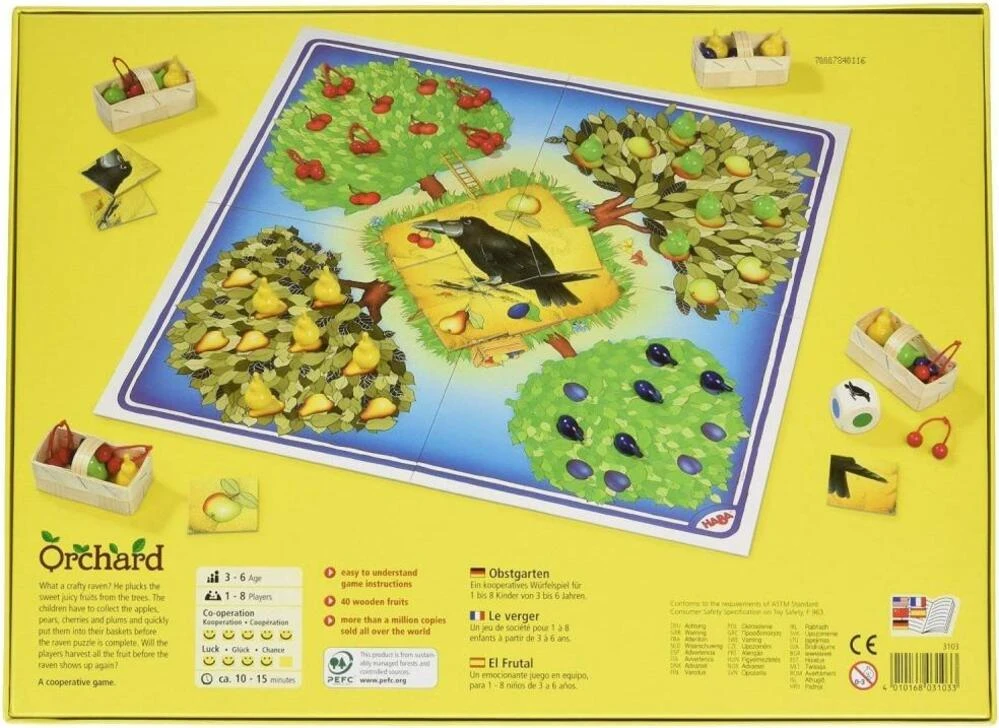 - Stromy v sadu jsou plné ovoce, úkolem hráčů je chránit jej před drzým havranem. - Záleží na tom, jaký symbol padne na kostce. Podle toho hráči umístí ovoce buď do košíku nebo k havranovi.