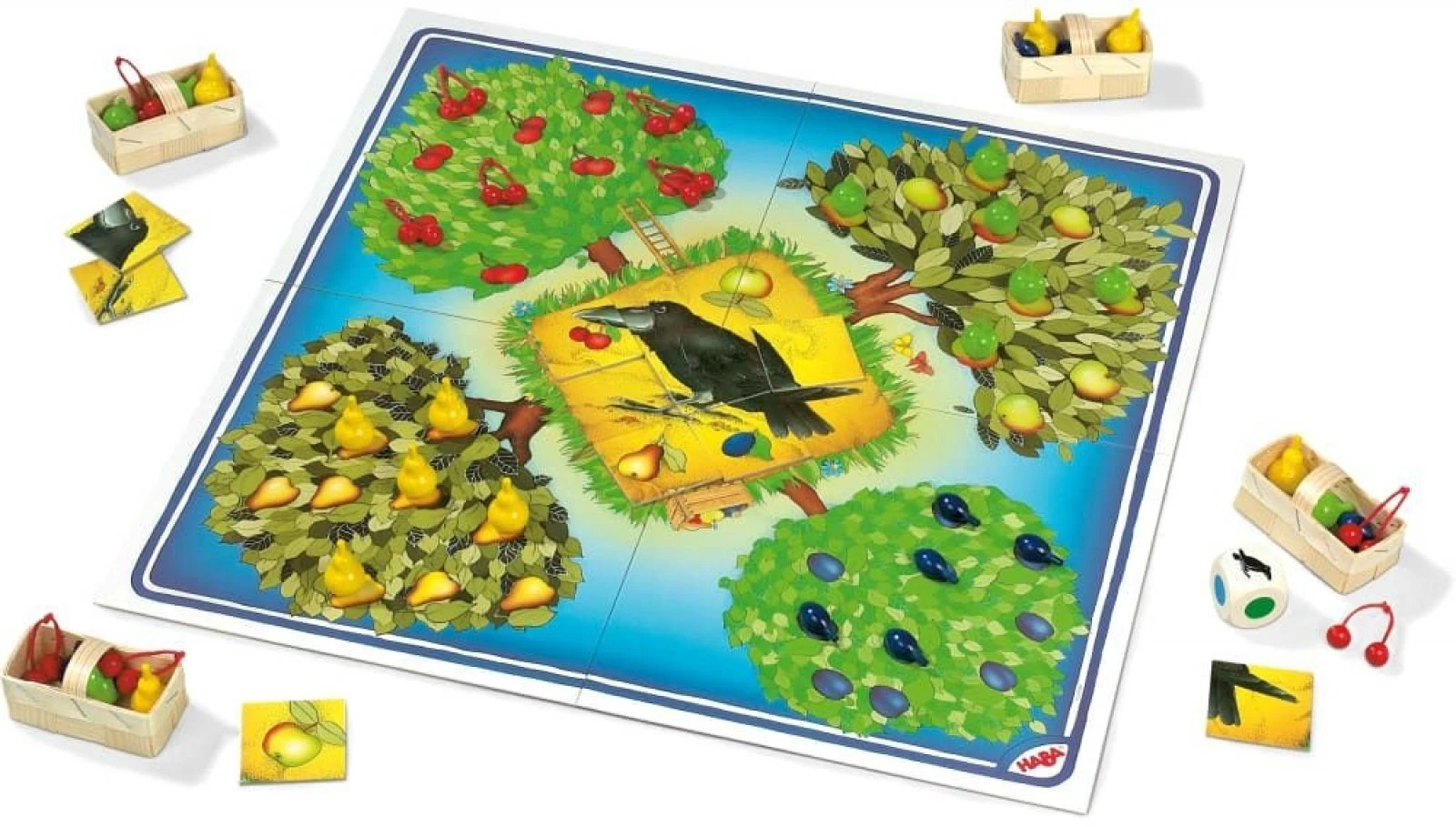- Obsah balení: 10 jablek, 10 hrušek, 10 párů třešní, 10 švestek, 4 koše, 1 skládanka havrana z 8 dílů, 1 barevná kostka se symboly, 1 herní deska, pravidla.