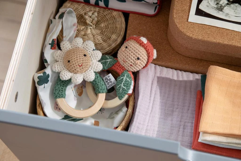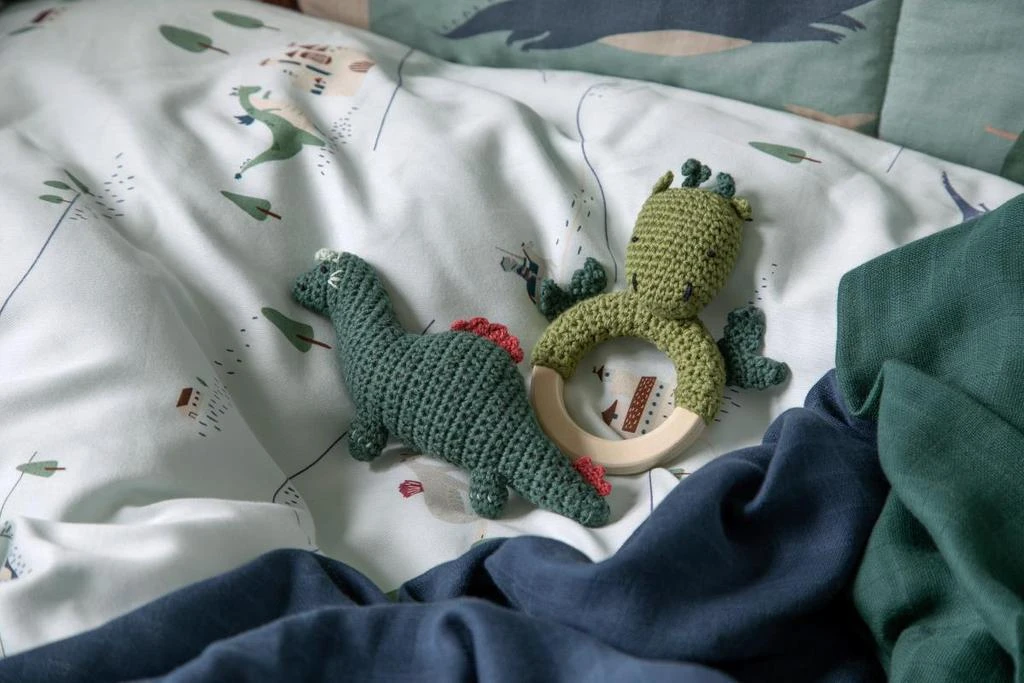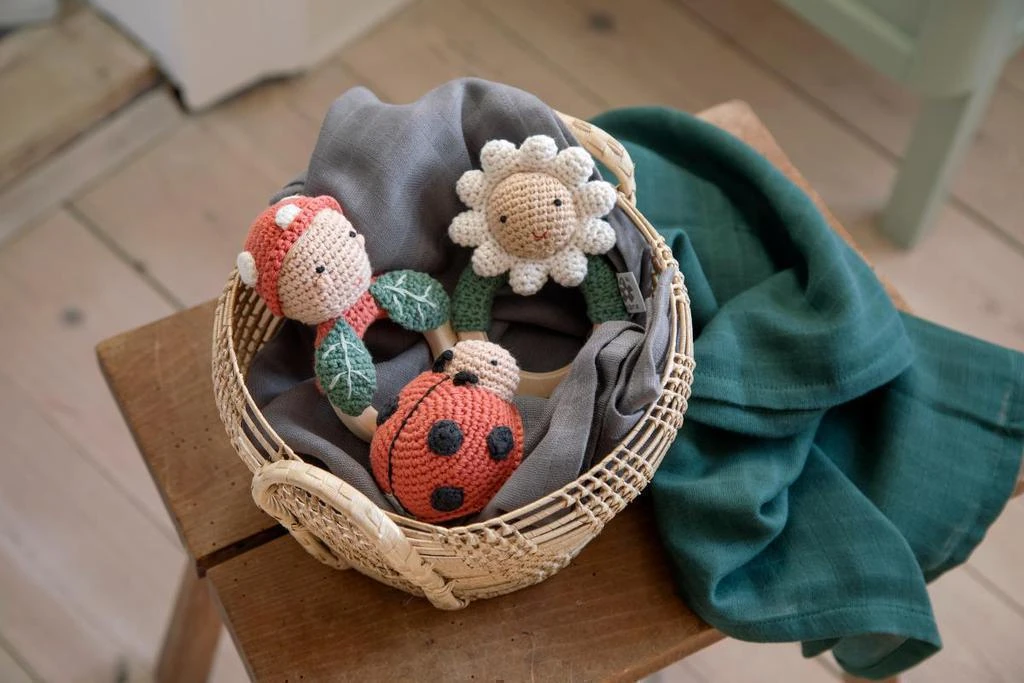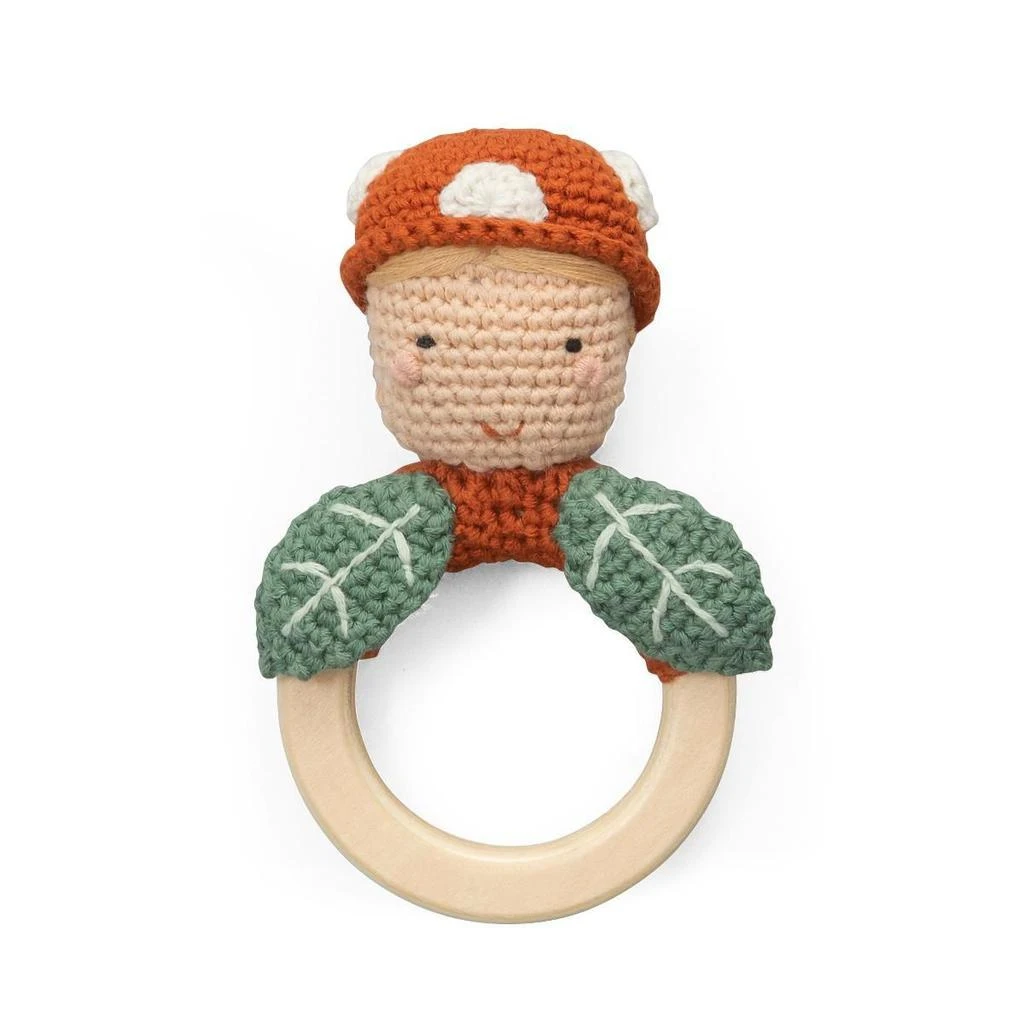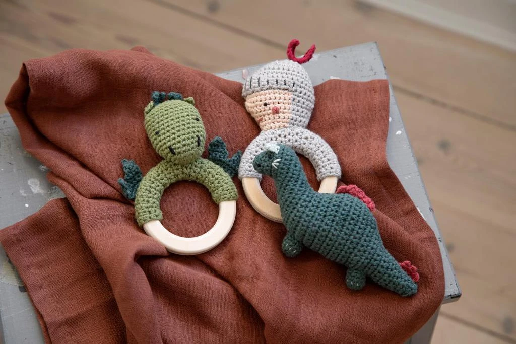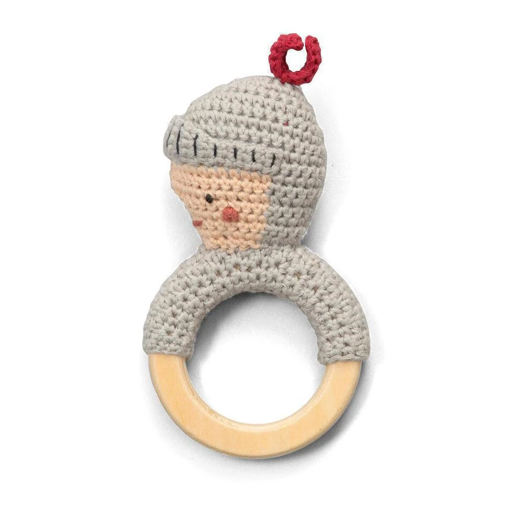 Ručně háčkované chrastítko s odvážným rytířem na dřevěném kroužku, vyrobené z organické bavlny s výplní z recyklovaného polyesteru.