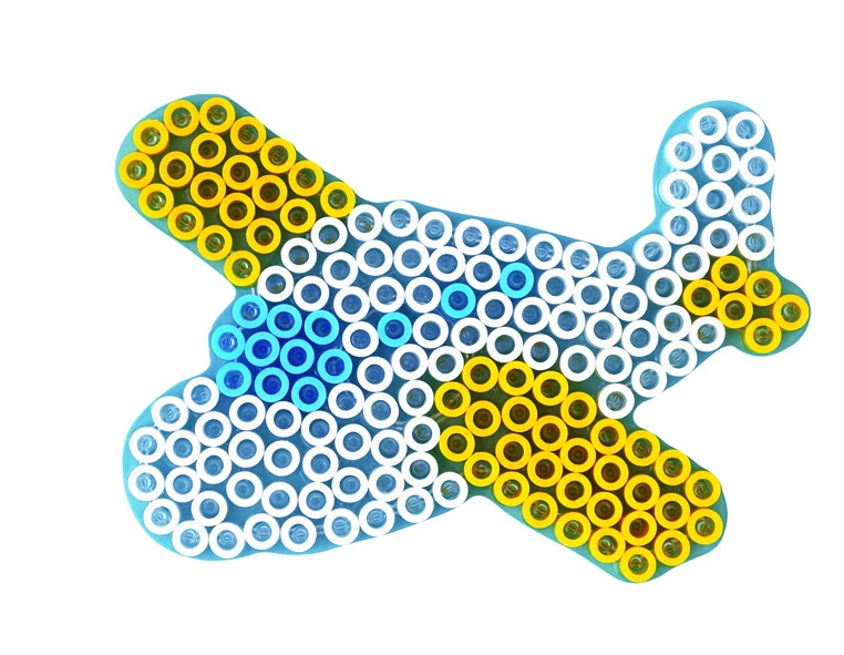 Průhledná podložka ve tvaru letadla je určená pro zažehlovací korálky HAMA MAXI o průměru 10 mm. Má 162 hrotů a velikost 16 × 19 × 1 cm. Díky průhlednému materiálu lze podložku položit přímo na předlohu a děti mohou jednoduše skládat motiv podle obrázku v poměru 1:1, například z inspirativní knížky H399-17.