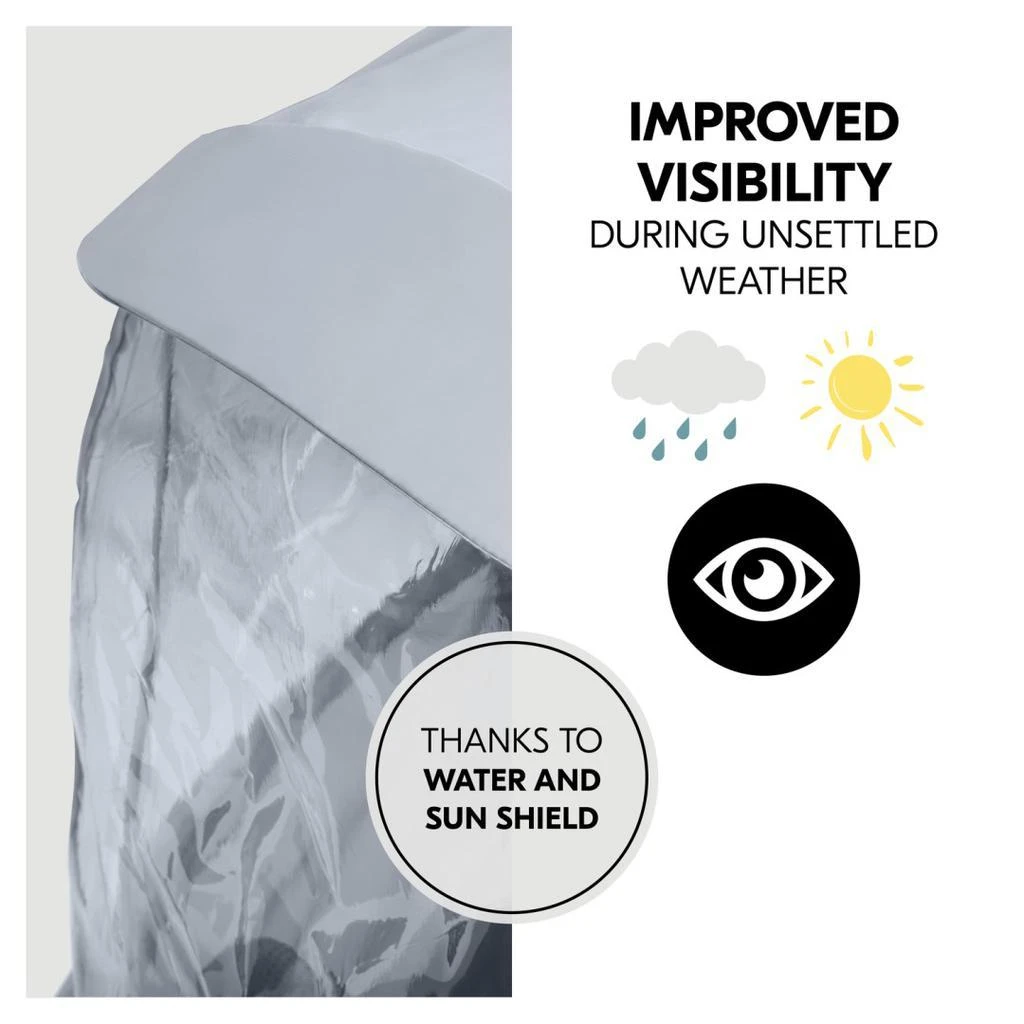 Při změnách počasí mezi deštěm a sluncem nabízí clona kromě rychlého odtoku vody podél PEVA fólie také lepší viditelnost.