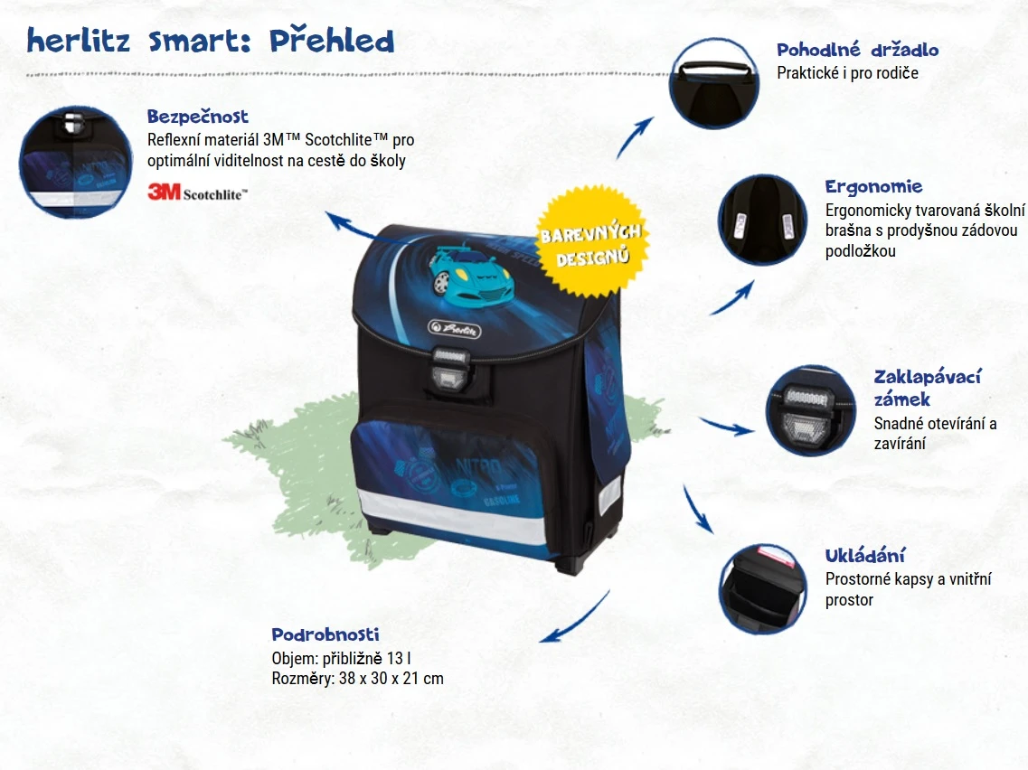 Lehká školní aktovka z kolekce Smart je určena pro prvňáčky. Nízká hmotnost a ergonomická, prodyšná výstelka zad nabízejí maximální komfort nošení. Prostorné přední a boční kapsy vytvářejí místo na svačinu a láhev. Optimální viditelnost ve tmě zajišťuje vysoce kvalitní reflexní materiál "3M Scotchlite". Další popis: