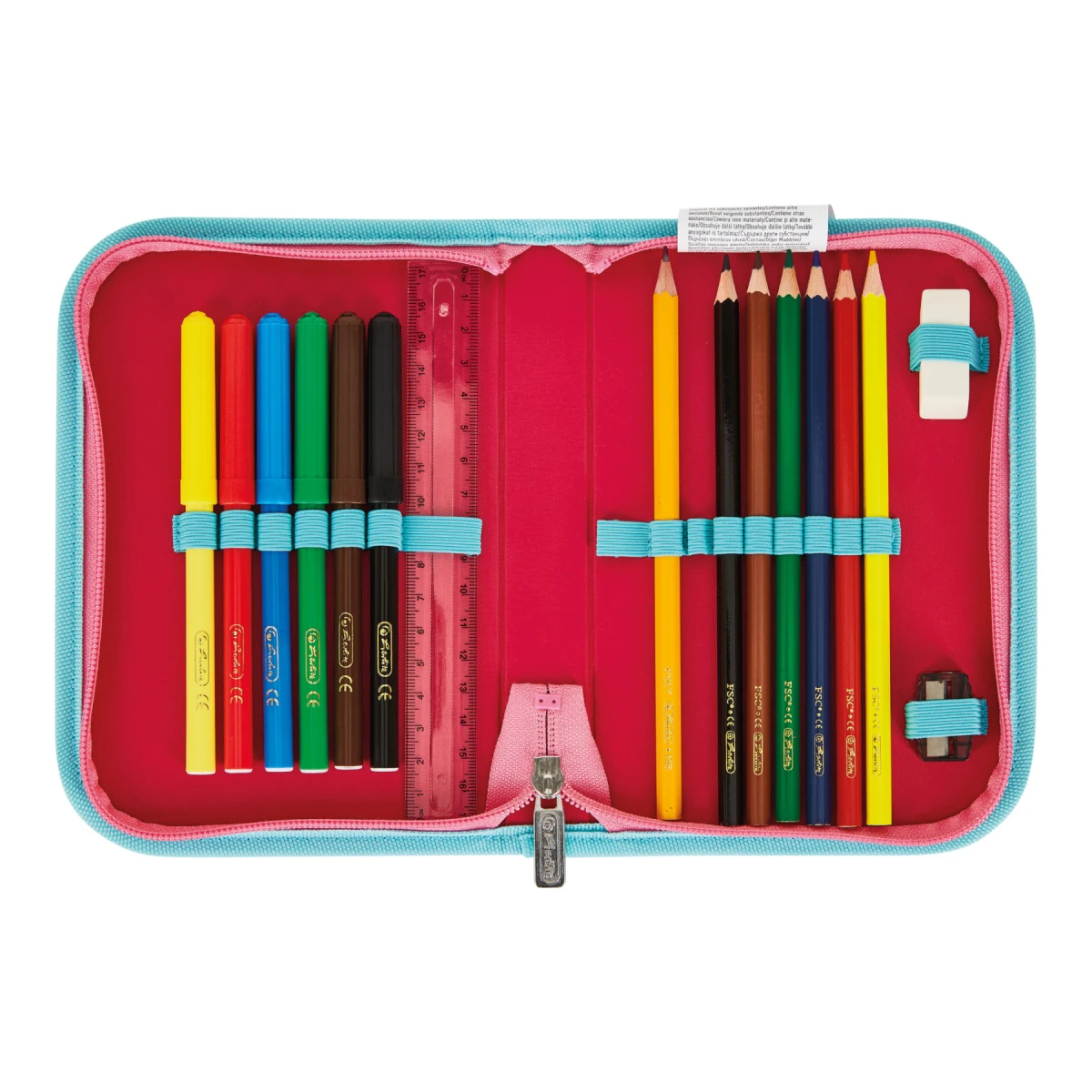 Výbava: penál 16 dílů: 6 fix, 6 pastelek s certifikací FSC, tužka, pravítko, guma, ořezávátko, sáček na cvičky, kulaté pouzdro.
