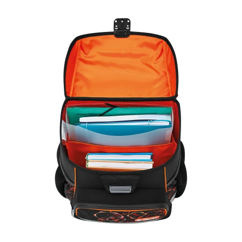 Ergonomicky tvarované a prodyšné polstrování zad, nastavitelné ramenní popruhy, výškově nastavitelný hrudní pás, hlavní kapsa s prostorem pro knihy, boční kapsy s elastickými pásky, přední kapsa na zip, stabilní spodní deska s nožičkami, pohodlná rukojeť, zavírání Click lock s odrazkou, reflexní materiály Oralite.