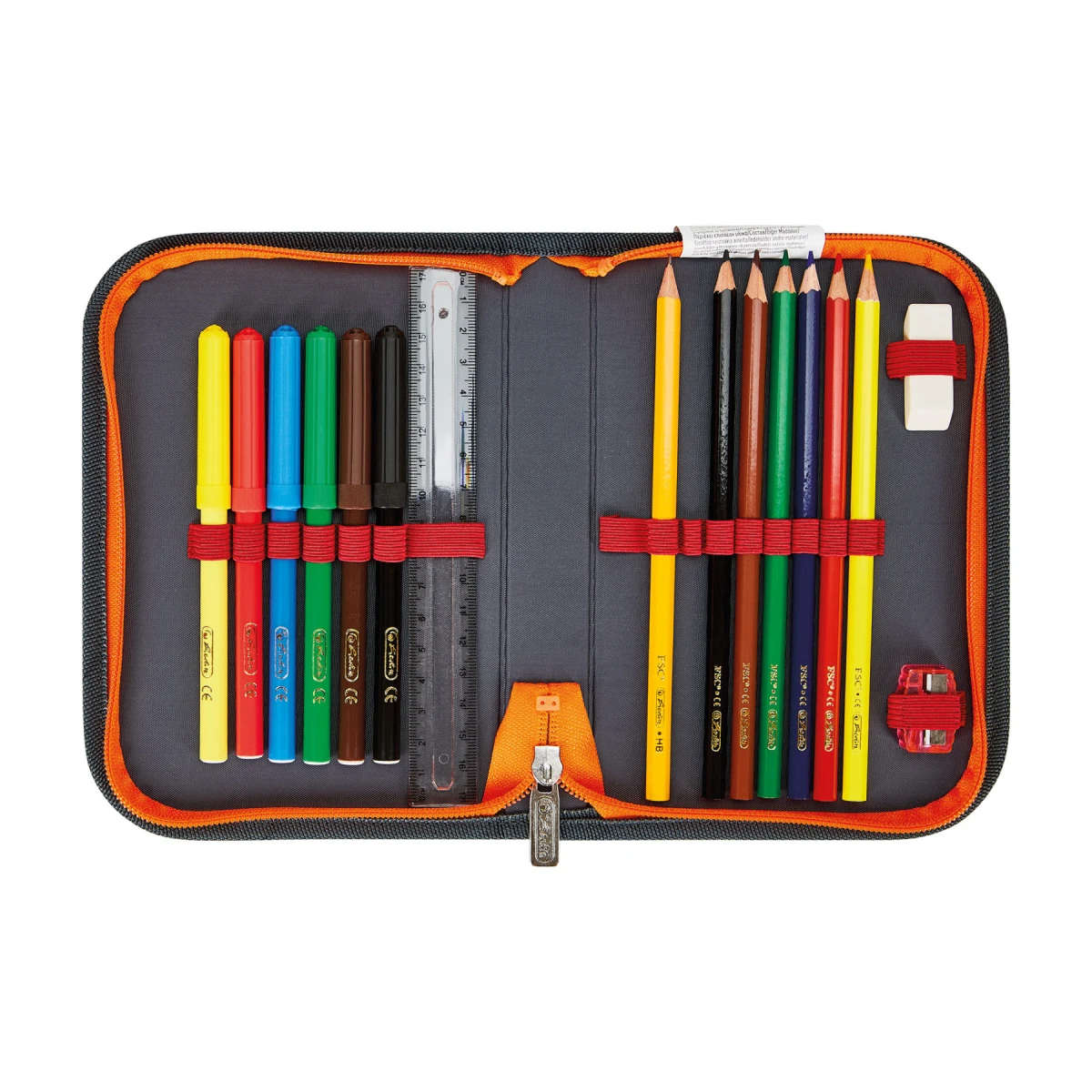 Vybavení: Pouzdro se 16 ks psacích potřeb: 6 fix, 6 pastelek, tužka, guma, ořezávátko, pravíko, kulaté pouzdro, Sportovní vak, box na svačinu.