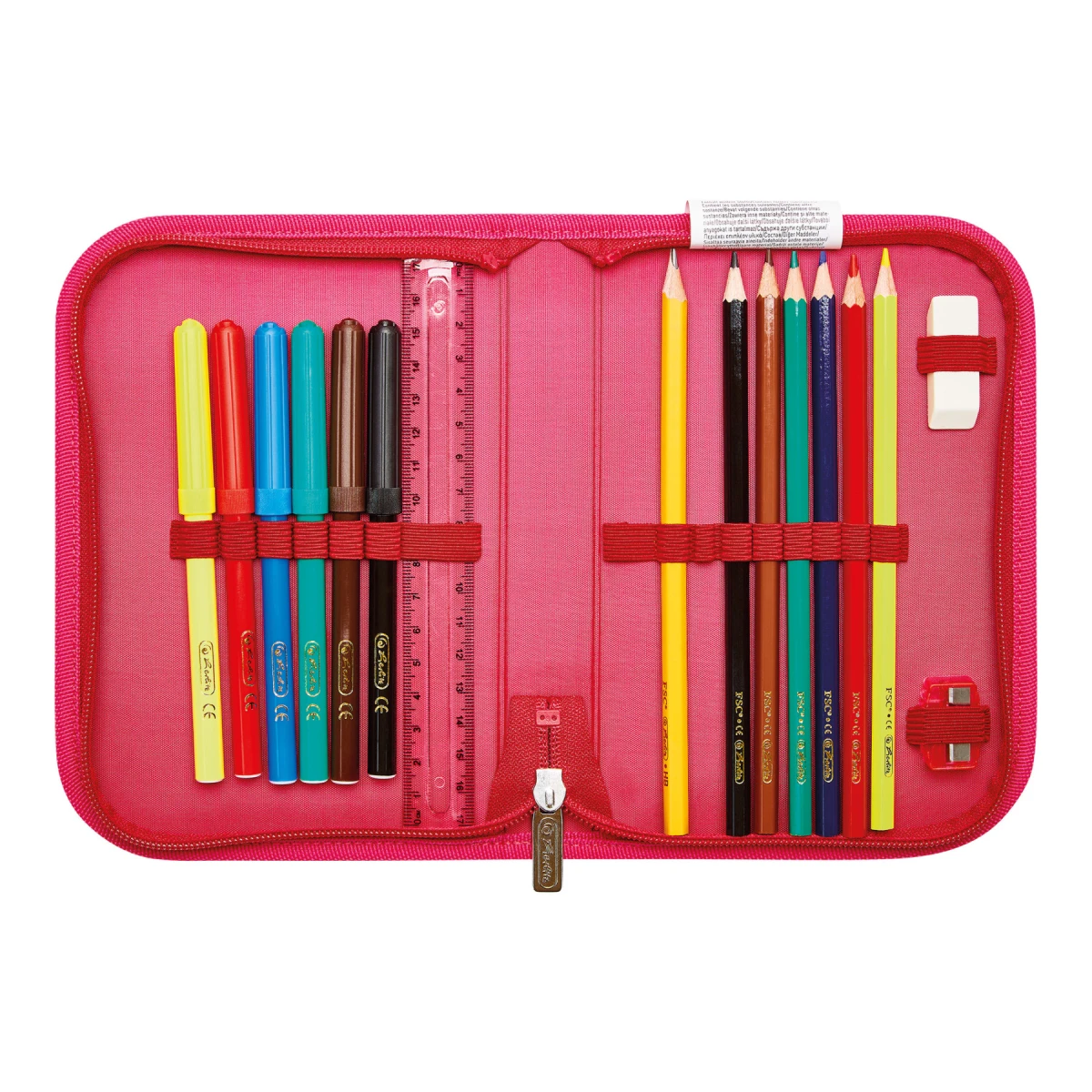 Výbava: penál 16 dílů: 6 fix, 6 pastelek, tužka, ořezávátko, guma, pravítko, sáček na cvičky, kulaté pouzdro.