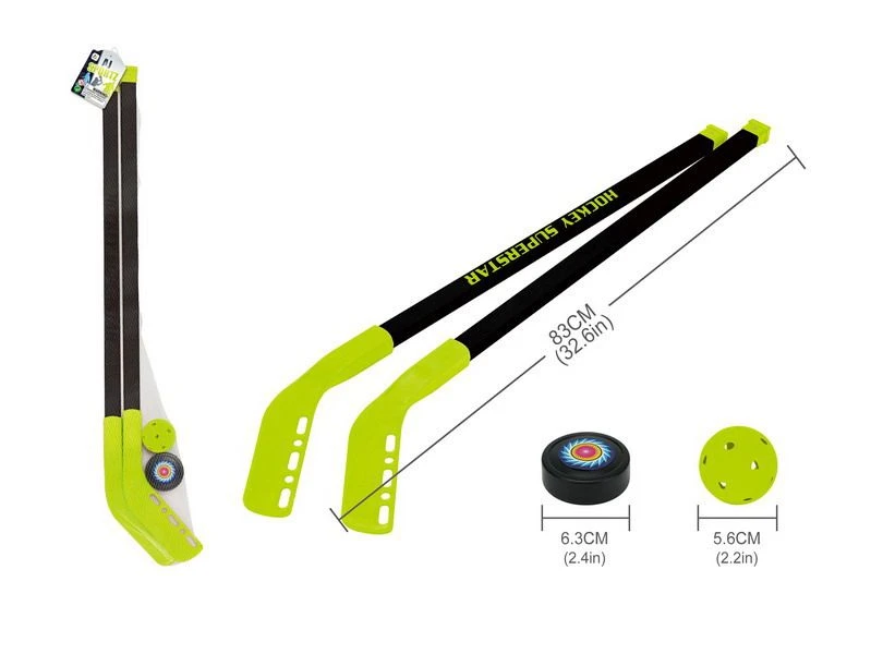 Obsah balení - 2x hokejka (délka hokejky 83 cm), 1x míček (5,6 cm), 1x puk (6,3 cm).