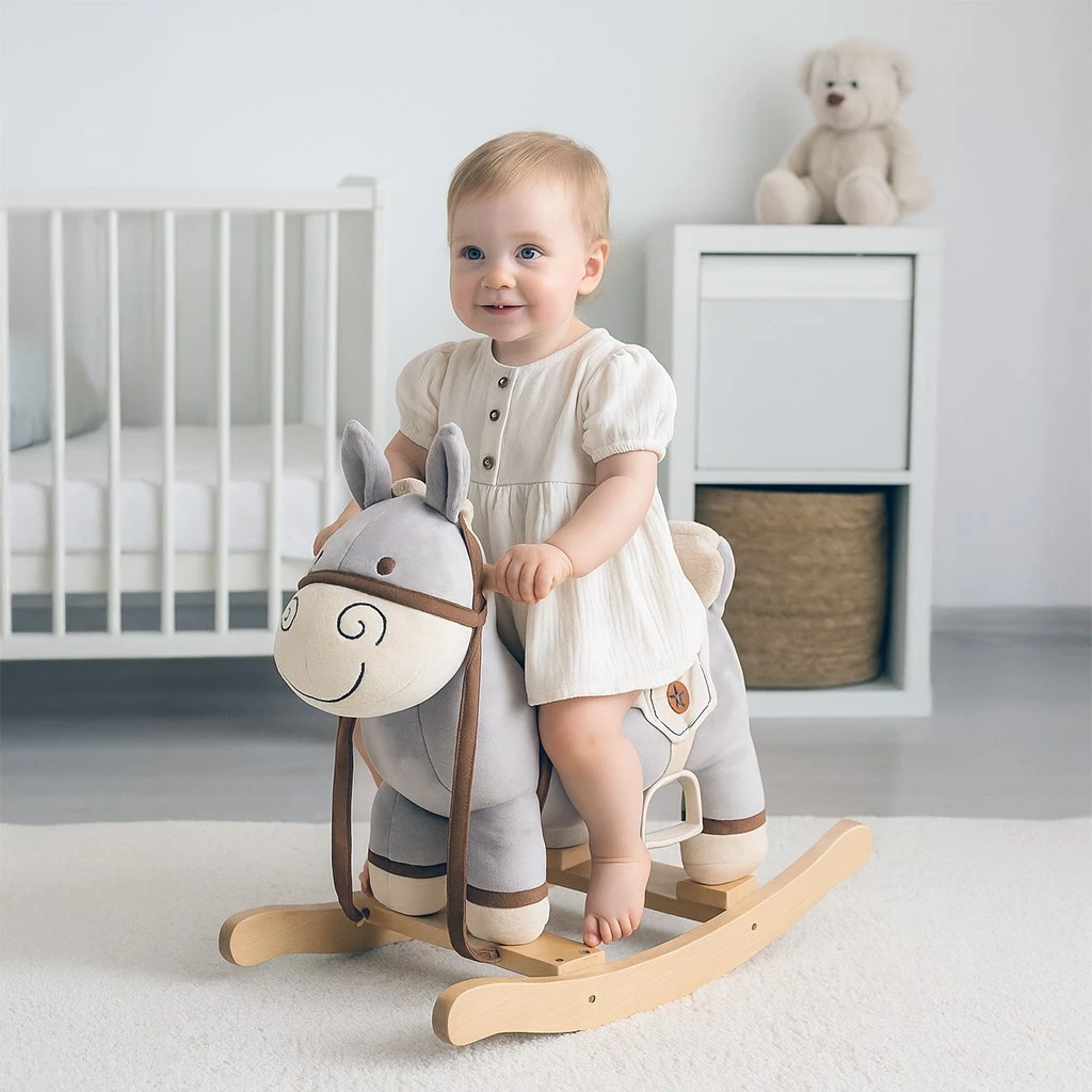 Krásný houpací oslík PlayTo byl navržen pro děti, které mají rády houpání a dobrodružství. Je vyroben z hebkého a velmi příjemného na dotyk plyšového materiálu. Po stisknutí ouška přehraje českou písničku "Prší, prší, jen se leje" nebo po stisknutí druhého ouška slovenskou verzi "Prší, prší, len sa leje". Baterie se vkládají do pouzdra umístěného na bříšku. Hračka pomáhá dítěti rozvíjet koordinaci pohybů a podňecuje jeho představivost.